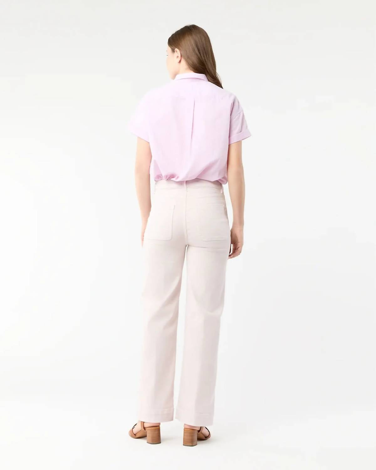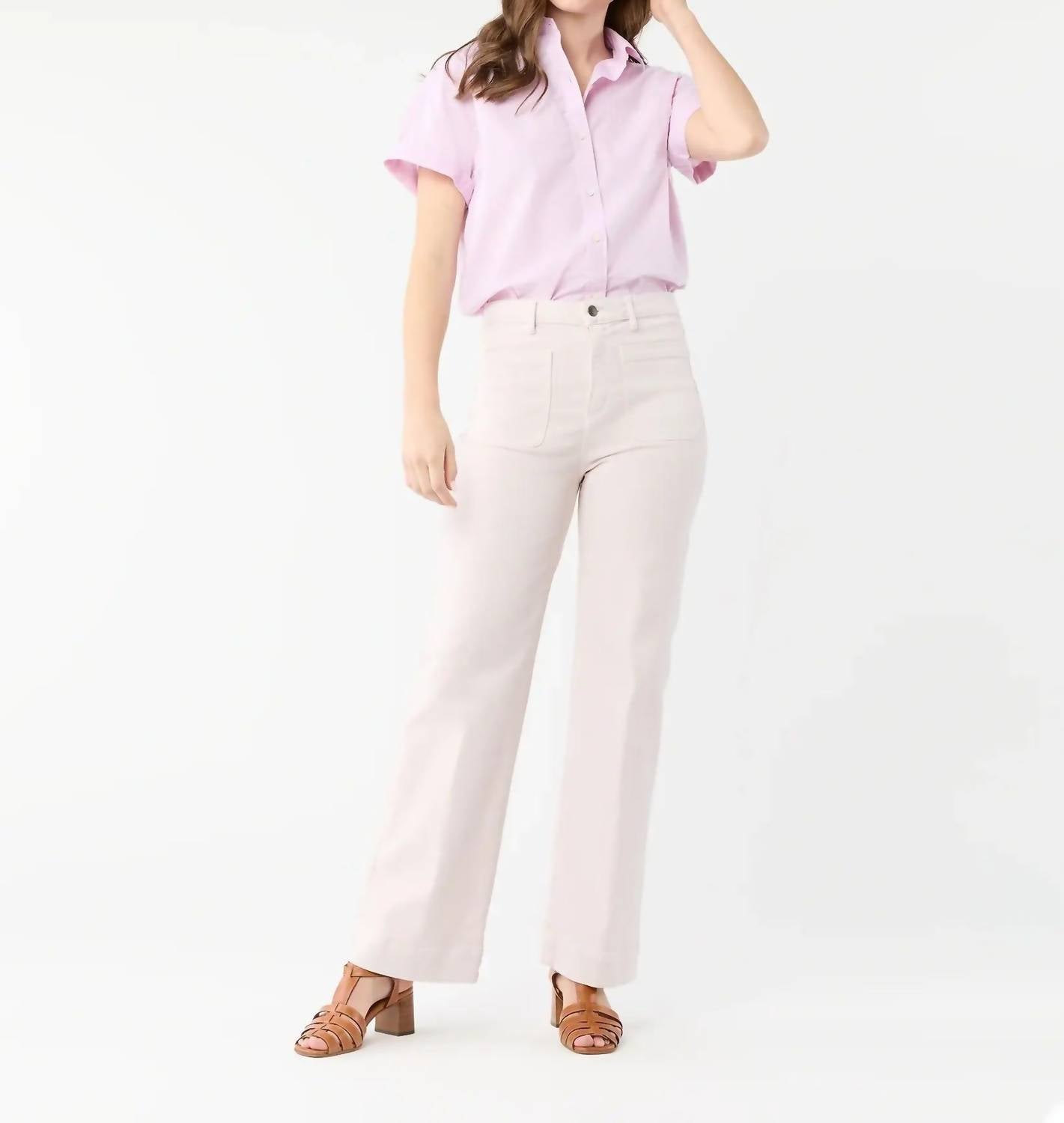 Pair these wide leg jeans with mules, slides or your favorite strappy sandals. Introducing the Women's Coco Patch Pocket Jean by Ann Mashburn, a stylish wide-leg pant in a solid pale pink stretch twill. Featuring a classic fit with patch pocket detailing, these jeans are crafted in Los Angeles for a minimalist vacation-ready aesthetic. The flattering high-rise design comes with a zip closure, adding practicality to its classic style. Enjoy the comfort of soft Cone Mills denim, perfectly embodying timeless elegance.