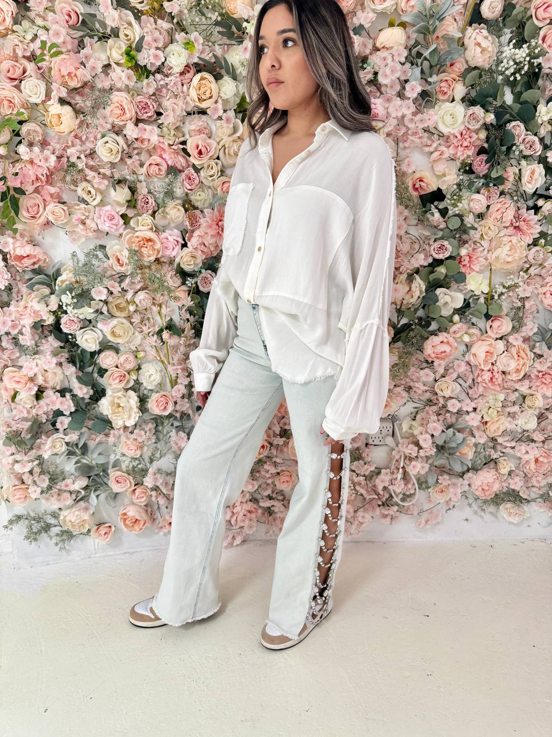 Elevate your casual wardrobe with the Sparkle and Shine Denim Jeans by Blue B, crafted in a light wash with a contemporary flare and wide leg style. These jeans feature a distinctive cut-out detail embellished with jewel trim for added sparkle. Composed of 78% Cotton, 20% Polyester, and 2% Spandex, they are designed with a zip closure for a secure fit. For best care, hand wash and line dry to maintain their unique charm.