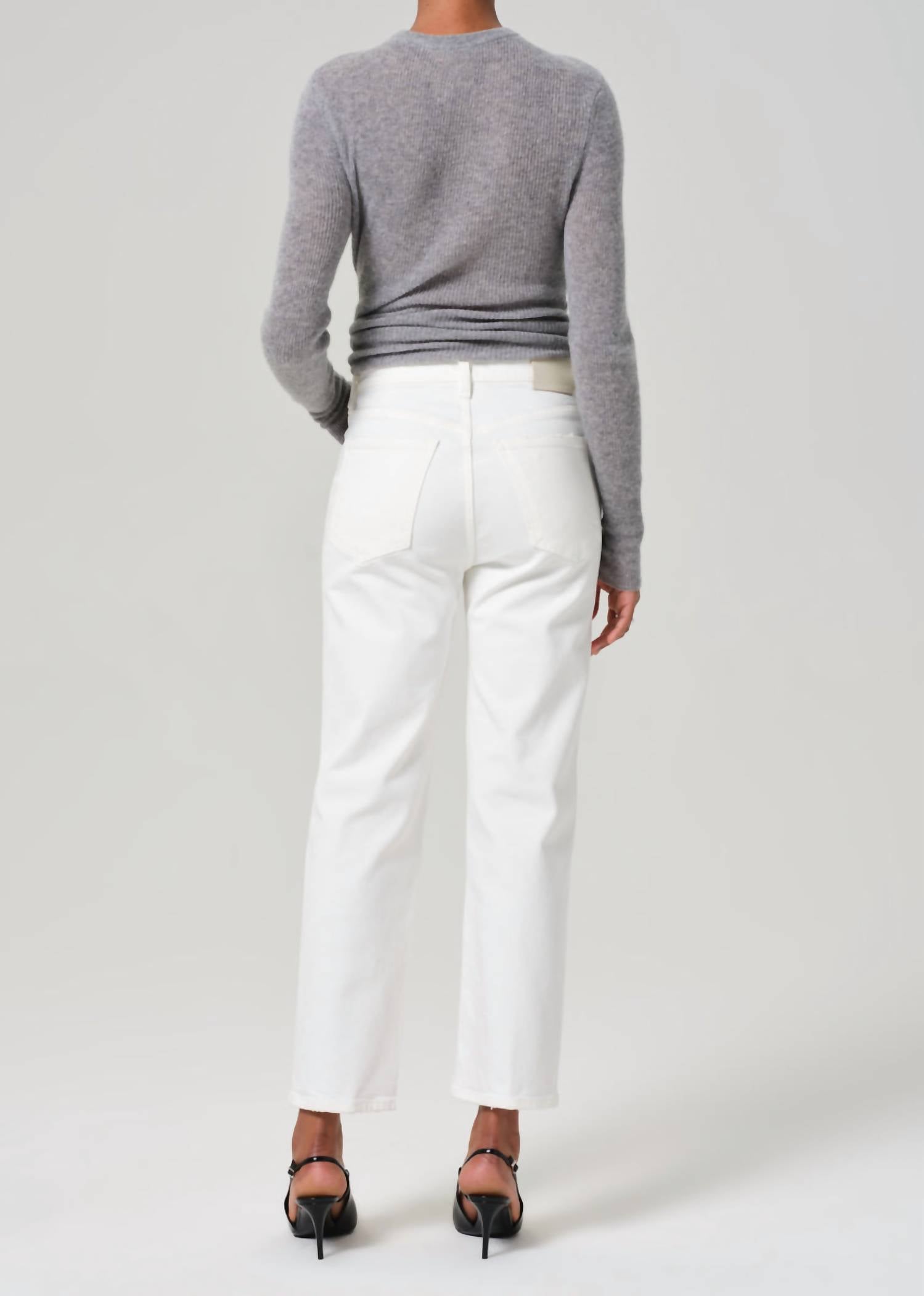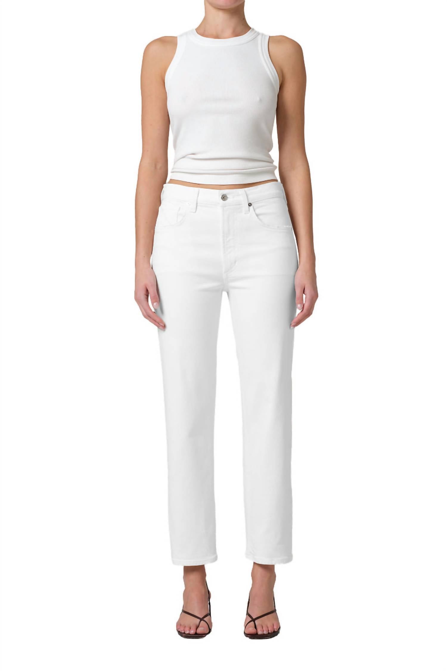 Pair these straight leg jeans with flats, sandals or even heels! You can't go wrong. Discover the Palma Straight Jeans by Citizens of Humanity, crafted in a high-rise, straight-leg silhouette. Made from a soft cotton blend in a chic Soft White hue, these jeans provide both comfort and style. Originating from Turkey, they feature a practical button closure and include pockets for convenience. For easy care, machine wash and tumble dry these classic fit jeans. With an inseam of 27.5 inches and a rise of 11 inches, their refined shape offers a polished look, perfect for every occasion from casual to church. 94% cotton, 4% polyester, 2% elastane.