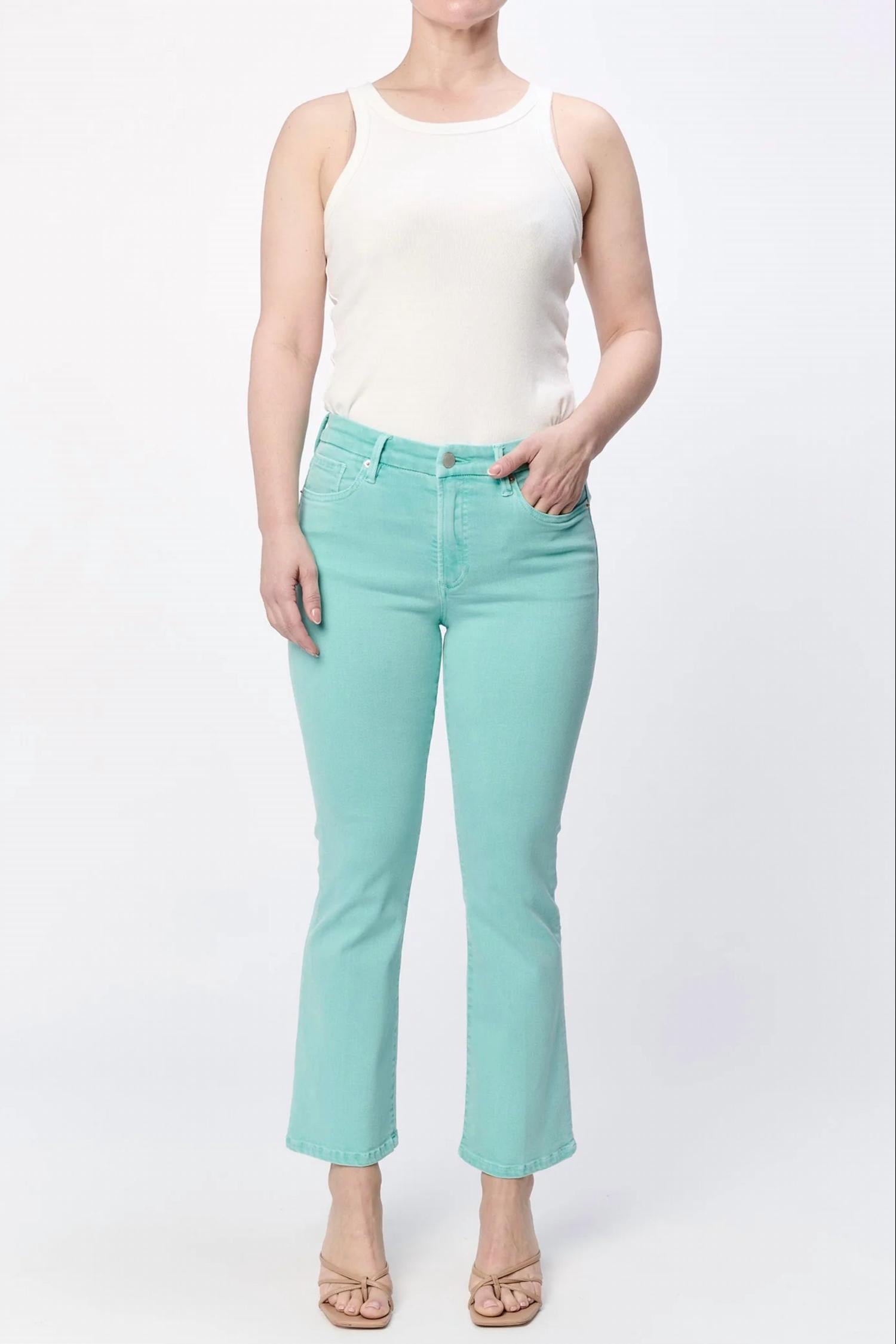 Slightly flared pants are all the rage right now and these are no exception. Pair these with your favorite tee for a more casual look, or with your favorite button-up blouse for an evening out. Elevate your summer wardrobe with the Women's Jeanne Flare Jean by DEAR JOHN DENIM, featuring a solid pool blue color that's perfect for a minimalist, vacation-ready look. These classic fit jeans boast a mid-rise with a front rise of 10 1/4" including waistband, a flared leg style, and a leg opening of 17". With an inseam of 26 3/4" for size 27, these jeans incorporate a zip closure and pockets for added convenience. Expertly crafted for comfort and stretch, they are your go-to choice for an effortlessly chic outfit.