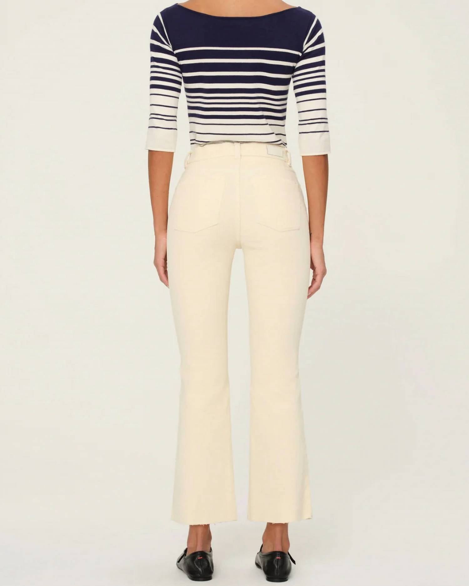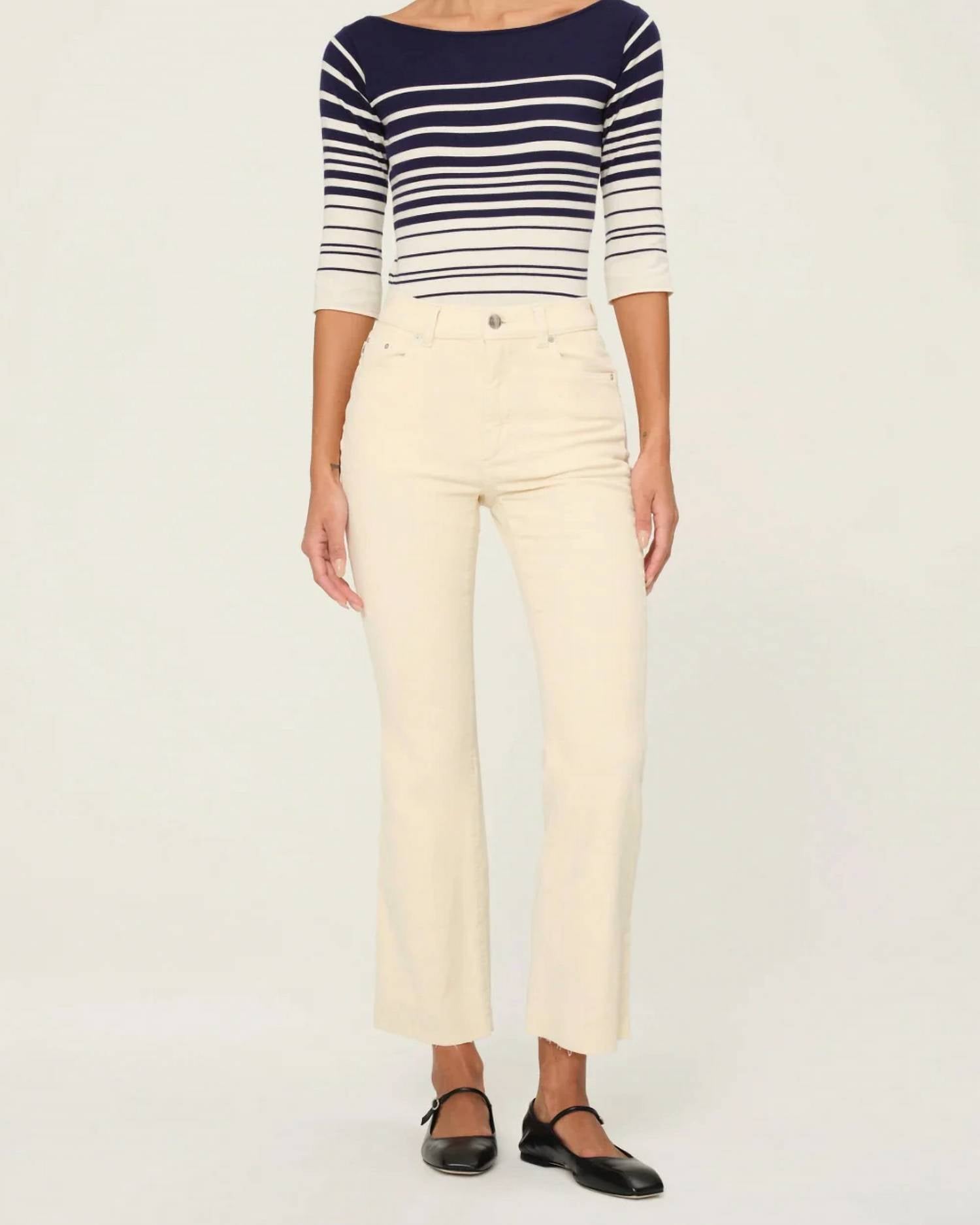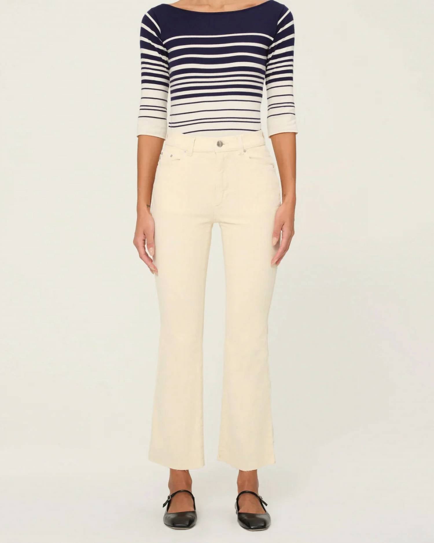 Comfortable and stylish, we love this cropped jean for all of the obvious reasons. Bridget is a high-rise, cropped boot cut fit that utilizes our Instasculpt technology to smooth, sculpt, and conform to your body for the perfect fit. Manilla is an off-white corduroy. It features silver hardware, tonal stitching, raw hem and an ecru back patch.