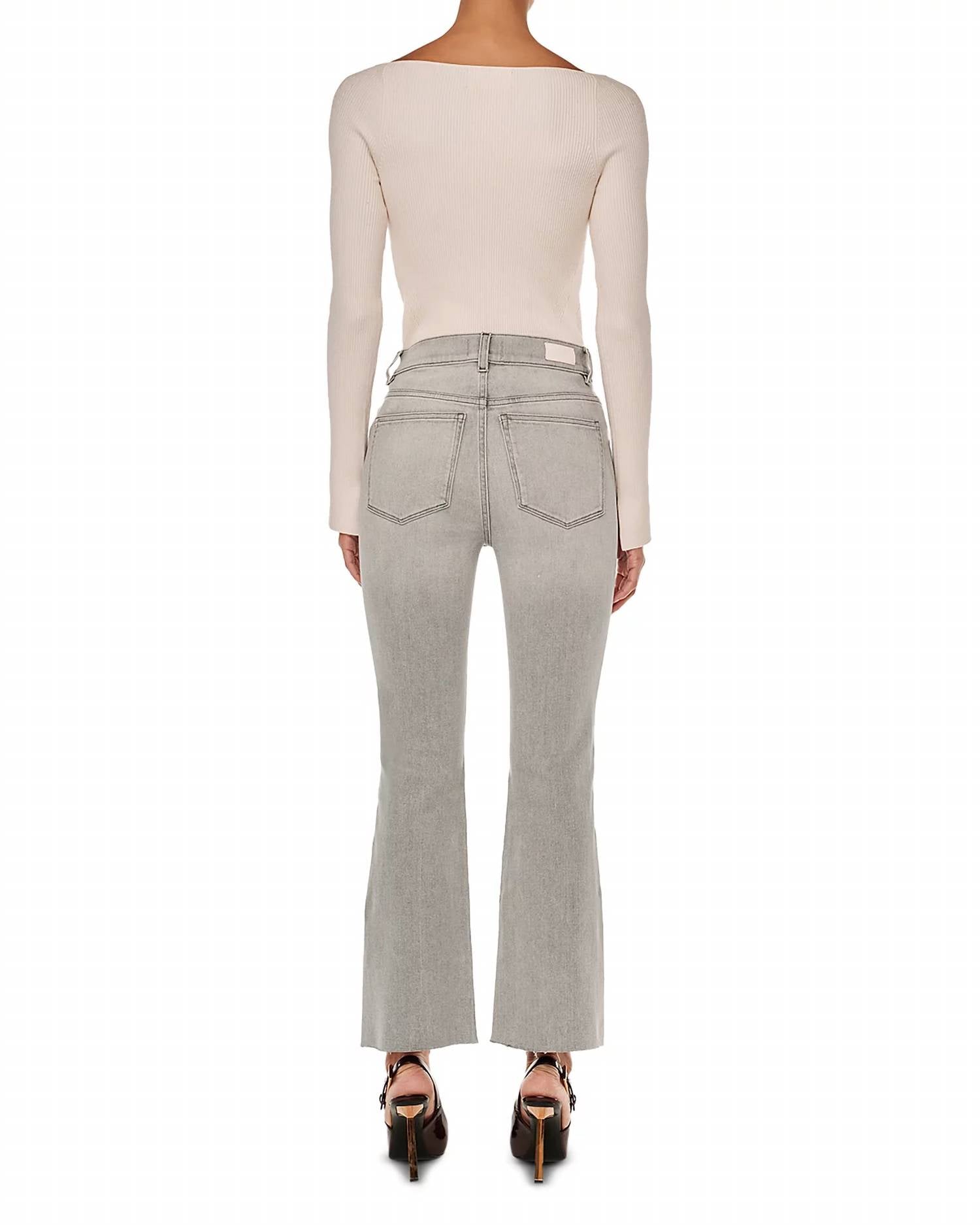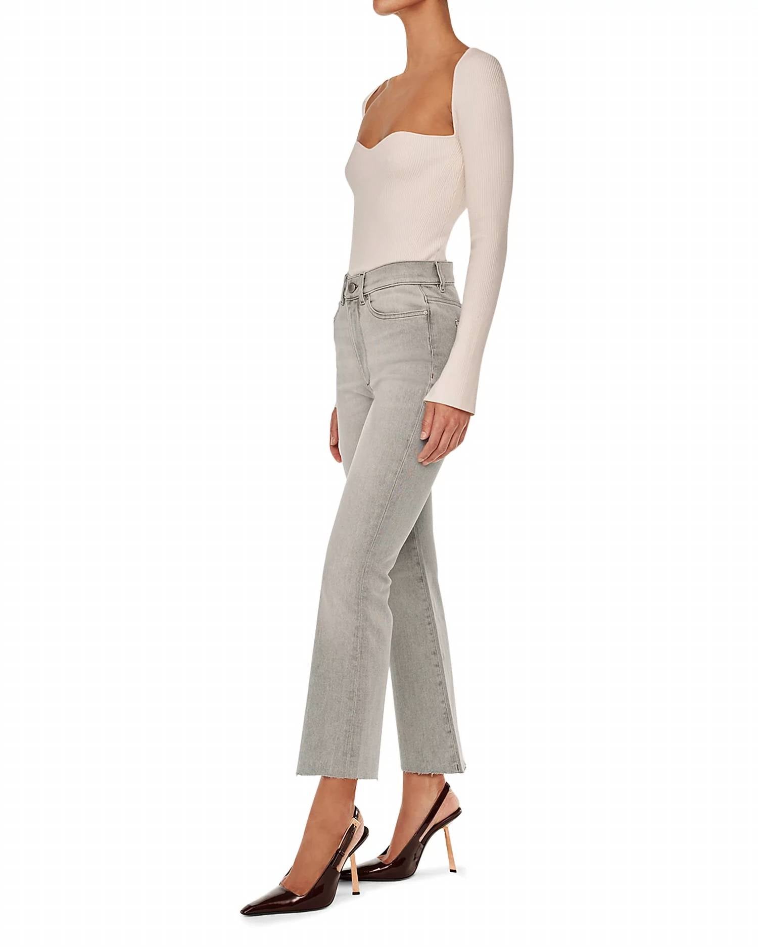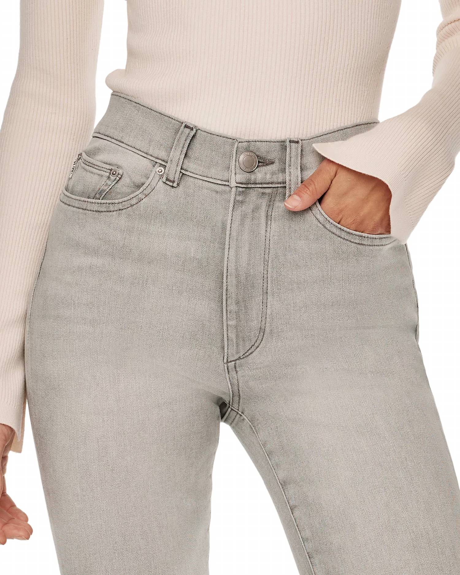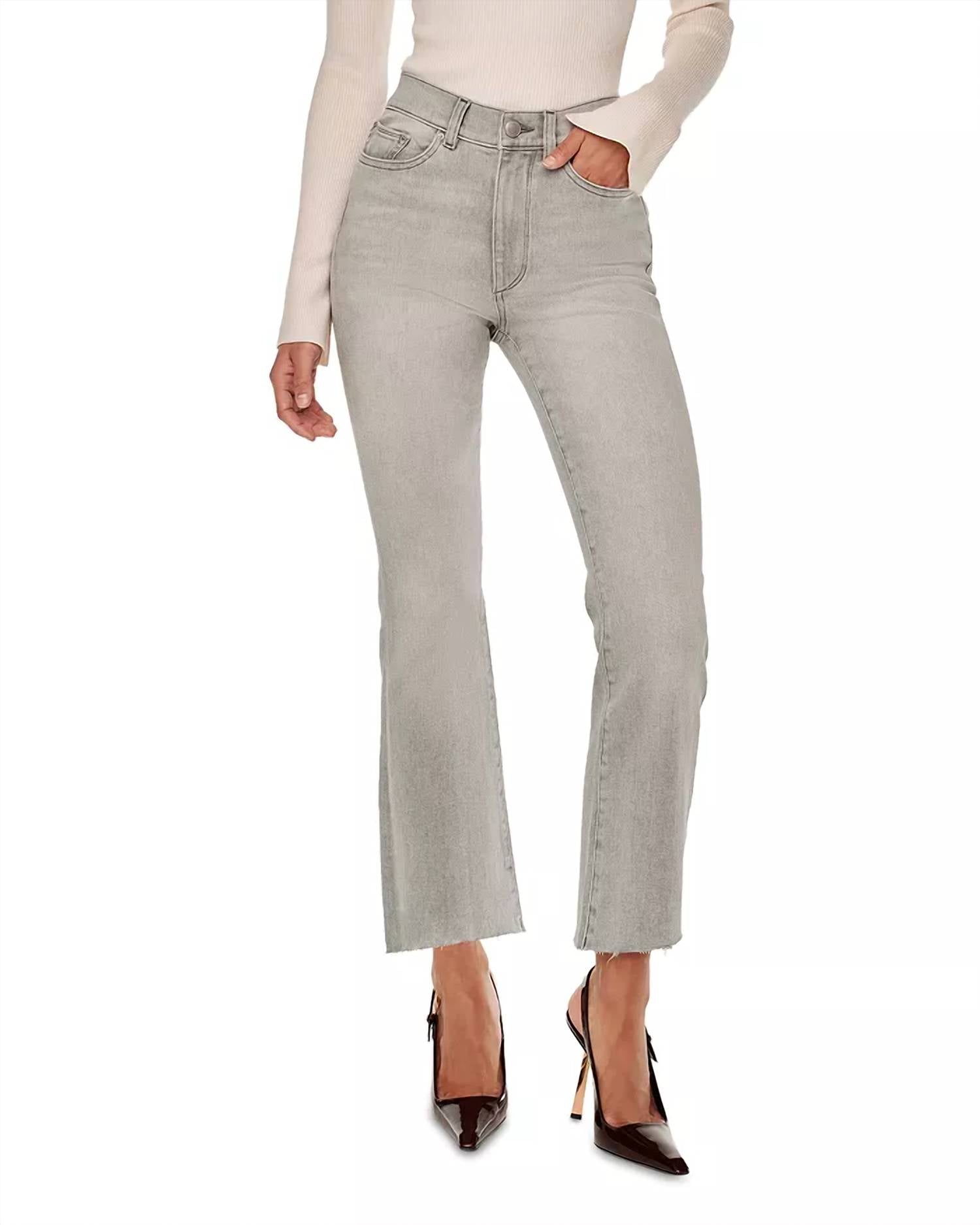 If you're looking for boot-cut, this is the jean for you. Introducing the Bridget Bootcut High Rise Crop Jeans by DL1961, a perfect blend of style and comfort in a Light Smoke hue. These jeans feature a high rise of 10 inches and an ankle inseam of 27 inches, tailored from a cotton blend for high-retention stretch that expertly shapes and lifts. The design includes a zip fly with button closure, functional five-pocket silhouette, and distinctive raw-edge hem for a modern touch, all complemented by tonal stitching and silver-tone logo hardware. Made with DL1961's Instasculpt™ technology, these jeans offer a flattering fit that maintains its form, crafted in an imported bootcut leg style that is machine washable. Model is 5'10" with measurements 33" bust, 25" waist, 35" hips, wearing a size 25. 93% Cotton, 6% Polyester, 1% Elastane.