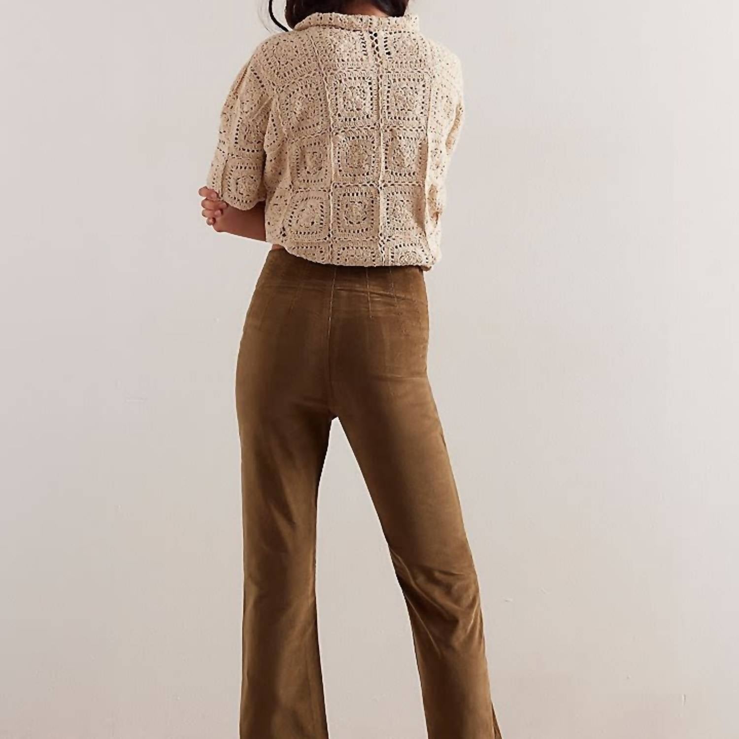 Pair these wide leg jeans with mules, slides or your favorite strappy sandals. Step into vintage-inspired style with the Jayde Cord Flare Jeans by Free People, perfect in a rich Chocolate Truffle hue for fall. These jeans feature a super high-rise and flared leg silhouette with exaggerated yoking details and an ultra-soft, stretchy cotton blend. Enjoy the flattering flat front and back with no pockets for a streamlined look, all highlighted by an exposed button closure. Care is easy with a simple machine wash cold, making them ideal for travel and Thanksgiving gatherings.
