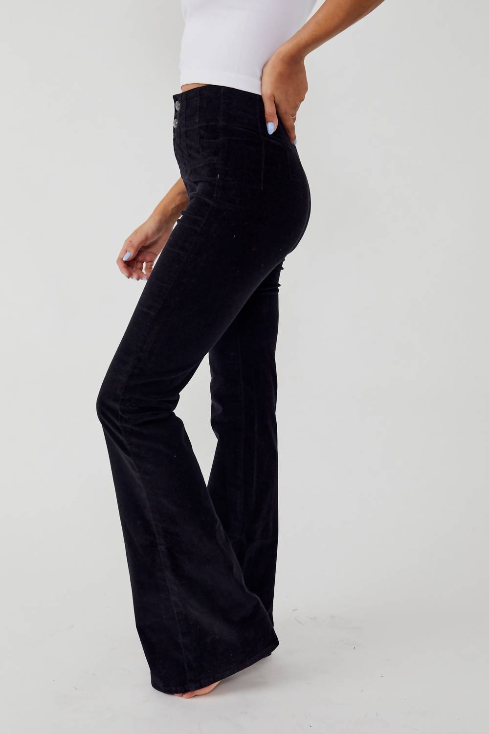 Just as cute as they are comfortable. Discover the Jayde Cord Flare Jeans by Free People, a stylish addition to your wardrobe with a high-rise and flared leg silhouette. Crafted from 98% Cotton, 2% Elastane, these black jeans feature a super high-rise with a 12.5-inch rise, 33.5-inch inseam, and a regular fit. These trendy jeans come with a zip closure and practical pockets, making them perfect for your summer streetwear looks. For care, machine wash and line dry are recommended.