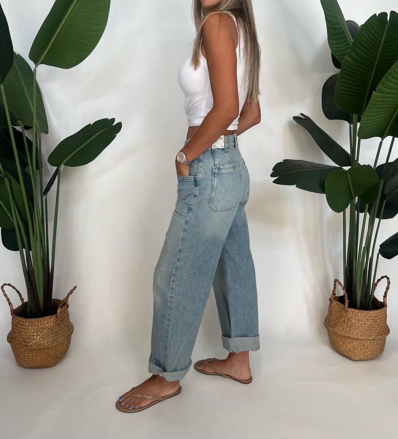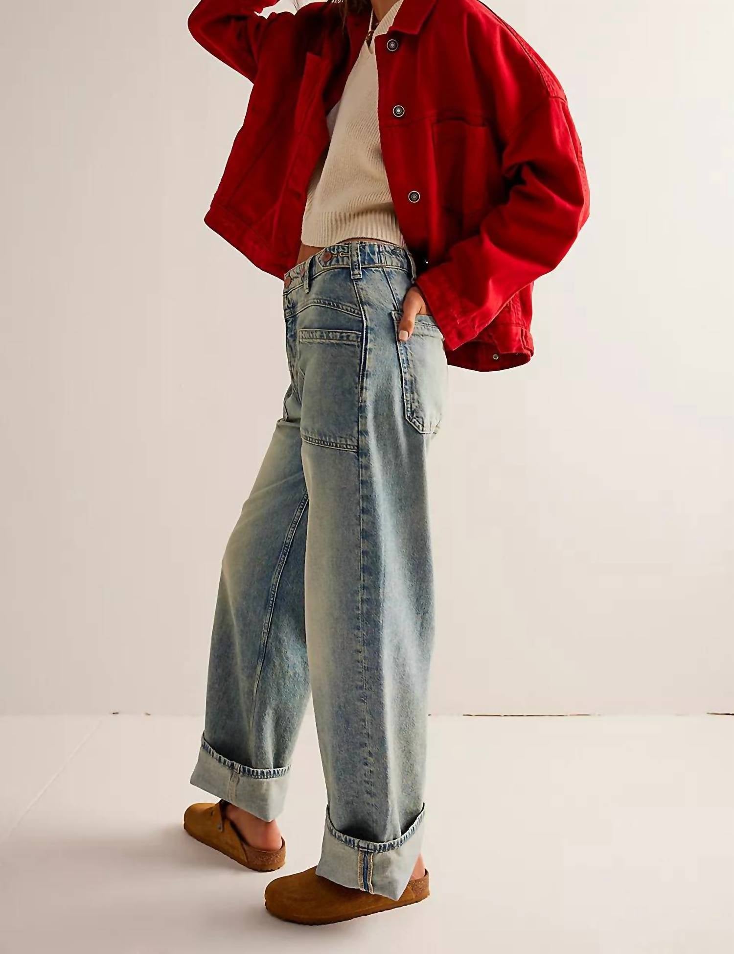Just as cute as they are comfortable. Meet the Palmer Cuffed Jeans by Free People, a quintessential piece for your denim collection. Crafted from 100% cotton, these mid-rise, relaxed wide-leg jeans offer a textured look in a stylish La La Land color. Featuring seam pouch pockets, yoking for enhanced shape, and a button closure at the waistband, they can be adjusted to be cuffed or uncuffed. These jeans are machine washable and can be tumble-dried for easy care, making them the perfect blend of comfort and trend-setting style.