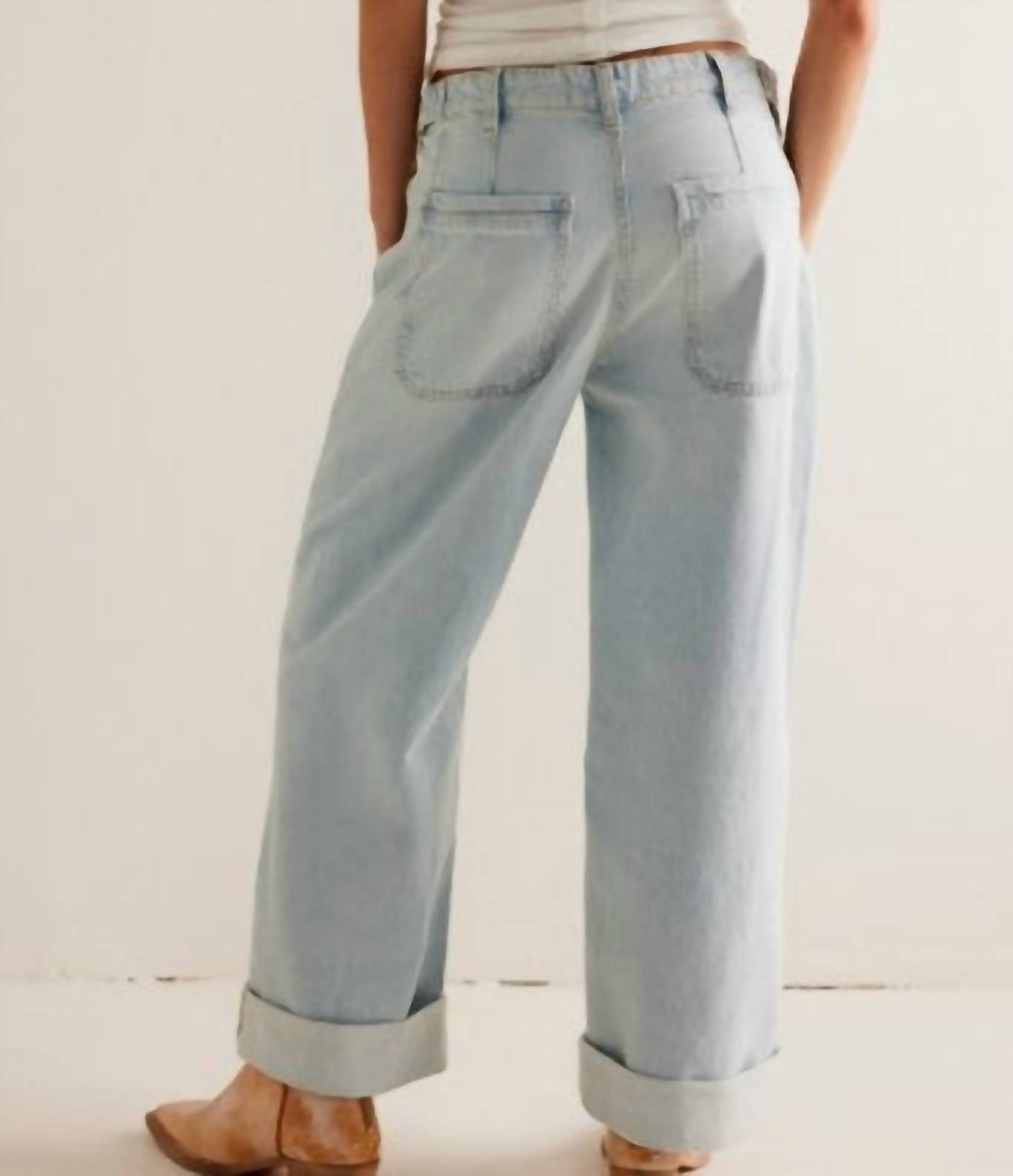 Step into summer style with the Women's Palmer Cuffed Baggy Jeans by Free People, presented in a refreshing Daydream Blue. These mid-rise jeans boast a relaxed, wide-leg silhouette with chic cuffed hems, offering a classic fit that's both comfortable and trendy. Made from durable, non-stretch denim, they're perfect for a laid-back, casual look. Closure: Zip. Ideal for streetwear-inspired vacation settings.