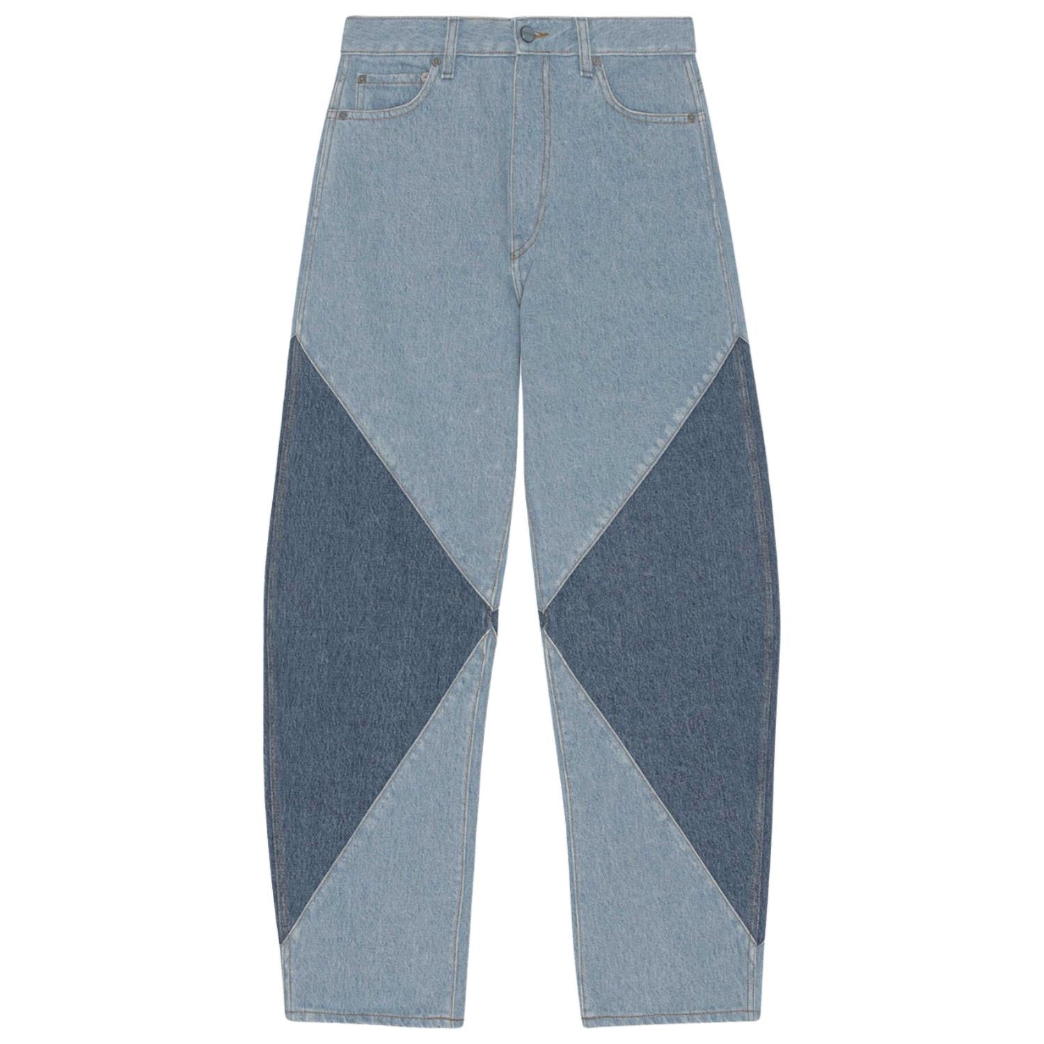 A flattering silhouette that's suprisingly versatile. Ganni Stary Jeans Organic Cotton in Cutline Bleach High Waist Wide Leg Patchwork Denim Curving, Tapered Leg Relaxed Fit Medium Weight 5 Pockets Belt Loops Zip/Button Closure