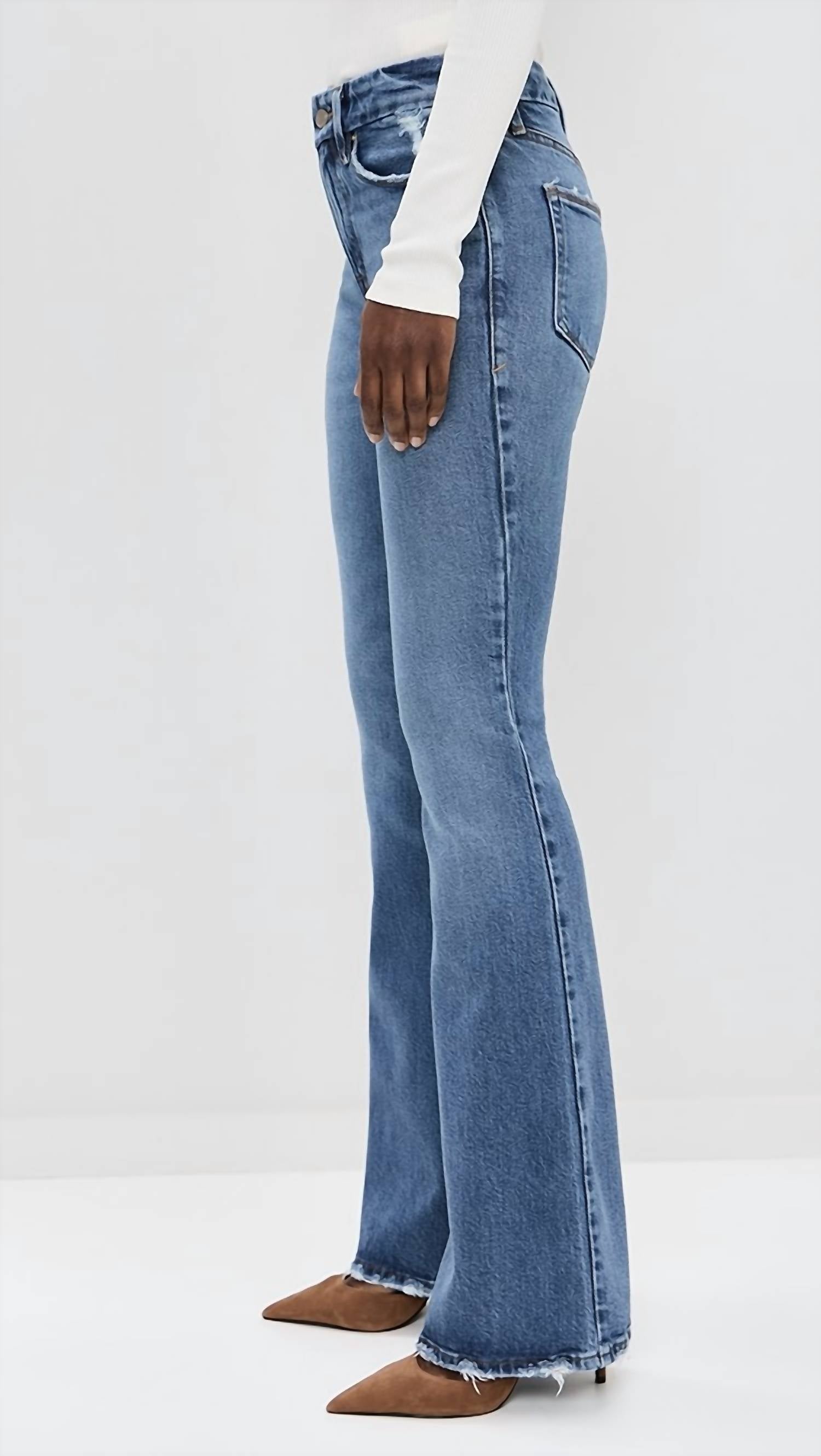 Presenting the Good Legs Flare Deep V Yoke Jeans by GOOD AMERICAN, a stylish choice for any wardrobe in a rich indigo hue. These women's jeans feature a high-rise waist and a textured pattern, offering a modern flair with practical pockets. The straight-leg design ensures a timeless fit. Closure: Button closure. Care: Machine wash.