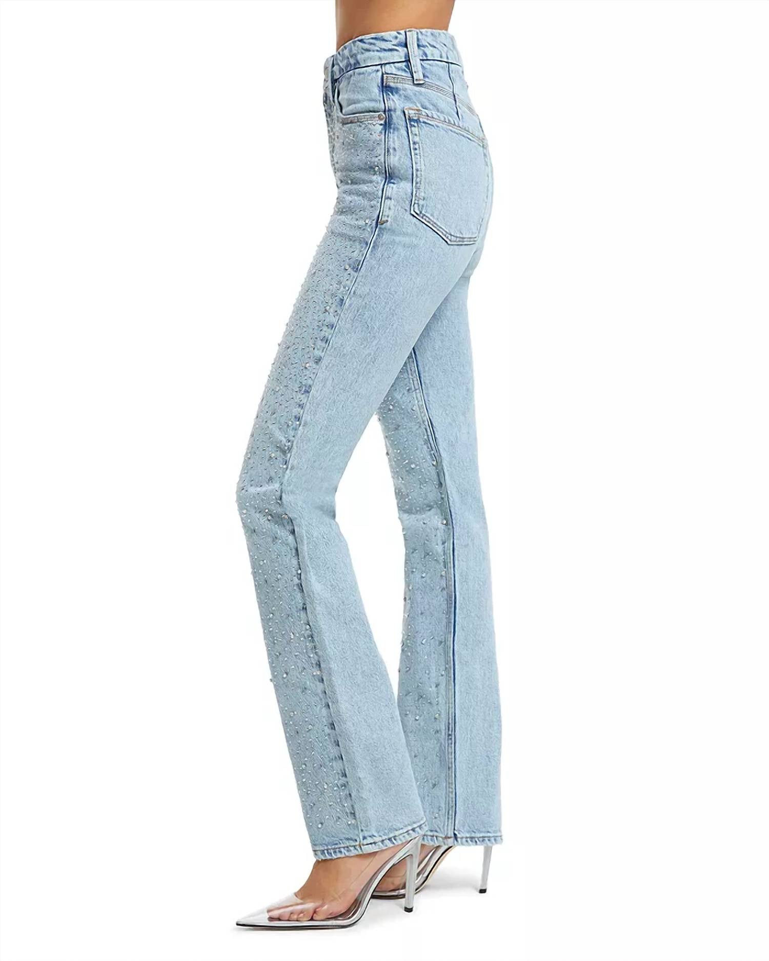 Zip fly with button closure, five-pocket silhouette. Contrast stitching, silver-tone hardware, belt loops. Rhinestone embellishments at front. Light blue wash, straight-leg silhouette. 32.5" Inseam. Model is 5'10" height, 33.5" bust, 23.5" waist, 34.5" hips, wearing a size 2. Machine wash cold. 100% Cotton,