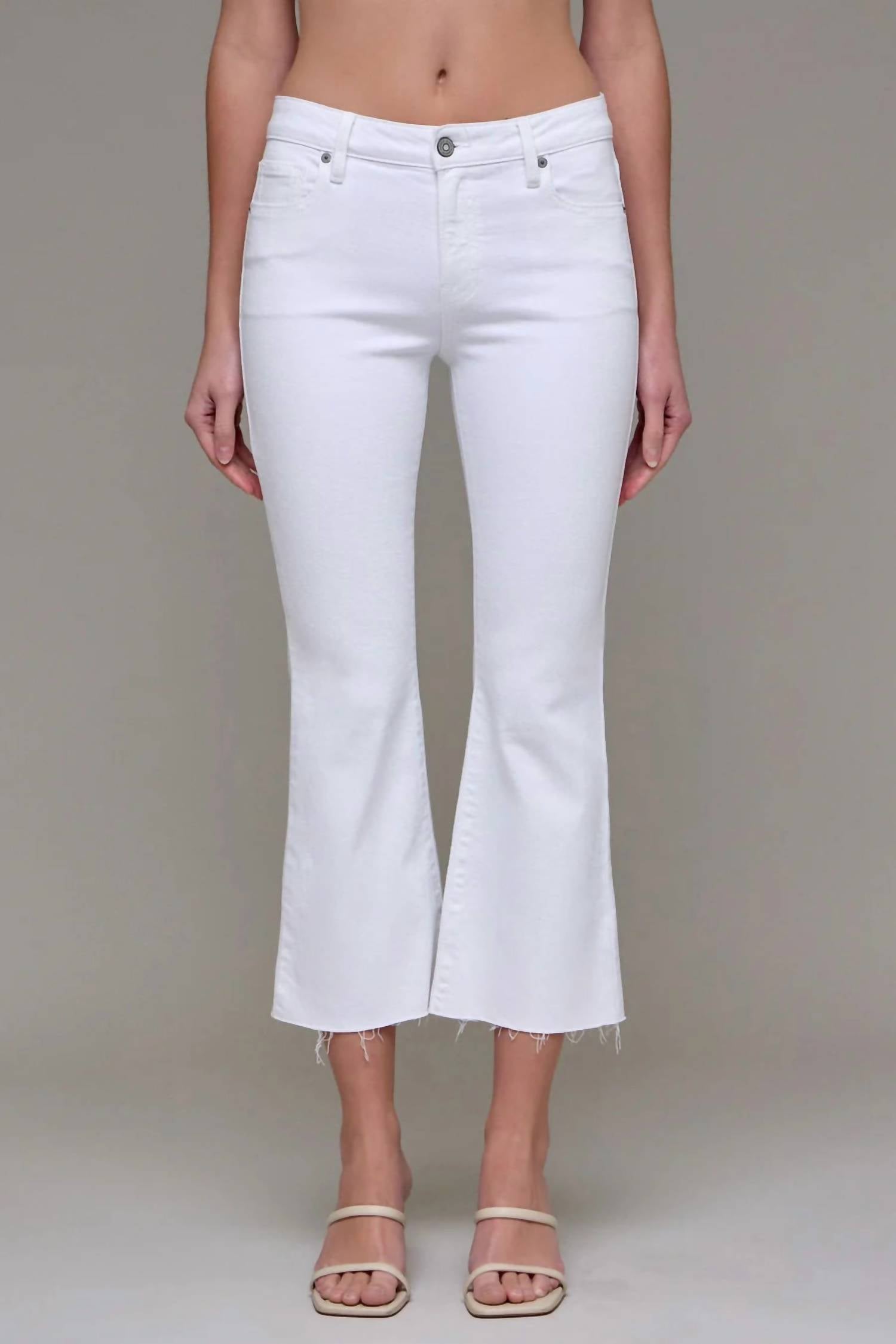 Upgrade your wardrobe with these cropped pants, designed to merge sophistication and wearability. The tailored fit ensures ultimate comfort during long days or nights out. Discover the Women's Happi 25” Inseam Cropped Jeans by HIDDEN, perfect for your summer vacation wardrobe. These solid white, wide-leg jeans feature a 25-inch inseam and a convenient button closure. Designed with practicality in mind, they come with pockets, making them both stylish and functional. Add a touch of elegance to your look with these ankle-cropped essentials.