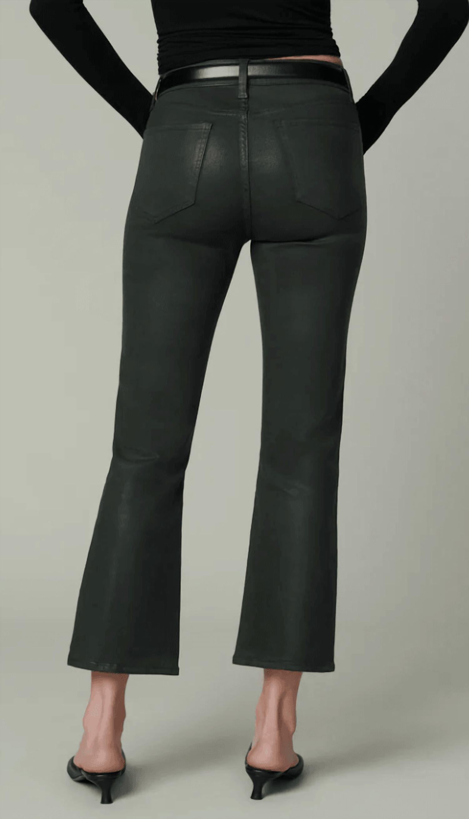 Fit to perfection, we love these high-waist jeans and you will too. Experience the Callie Coated High Rise Jeans by Joe's Jeans in the stunning Autumn Forest color, designed to bring a sleek touch to your wardrobe. These high-rise jeans feature a crop length with a 26.5" inseam and a flattering bootcut leg with a 16.5" opening, ensuring all-day comfort with their stretch denim composition. Made from a blend of 75% cotton, 13% lyocell, 9% rayon, and 3% elastane, they are perfect for streetwear style on vacation this spring. The jeans have a zip fly and button closure along with practical 5-pocket styling. Hand wash with care instructions to keep them in pristine condition by turning them inside out and drying flat to maintain the high-shine finish. Model Moa is 5'10" with a waist of 25" and hips of 35.5", wearing a size 26.