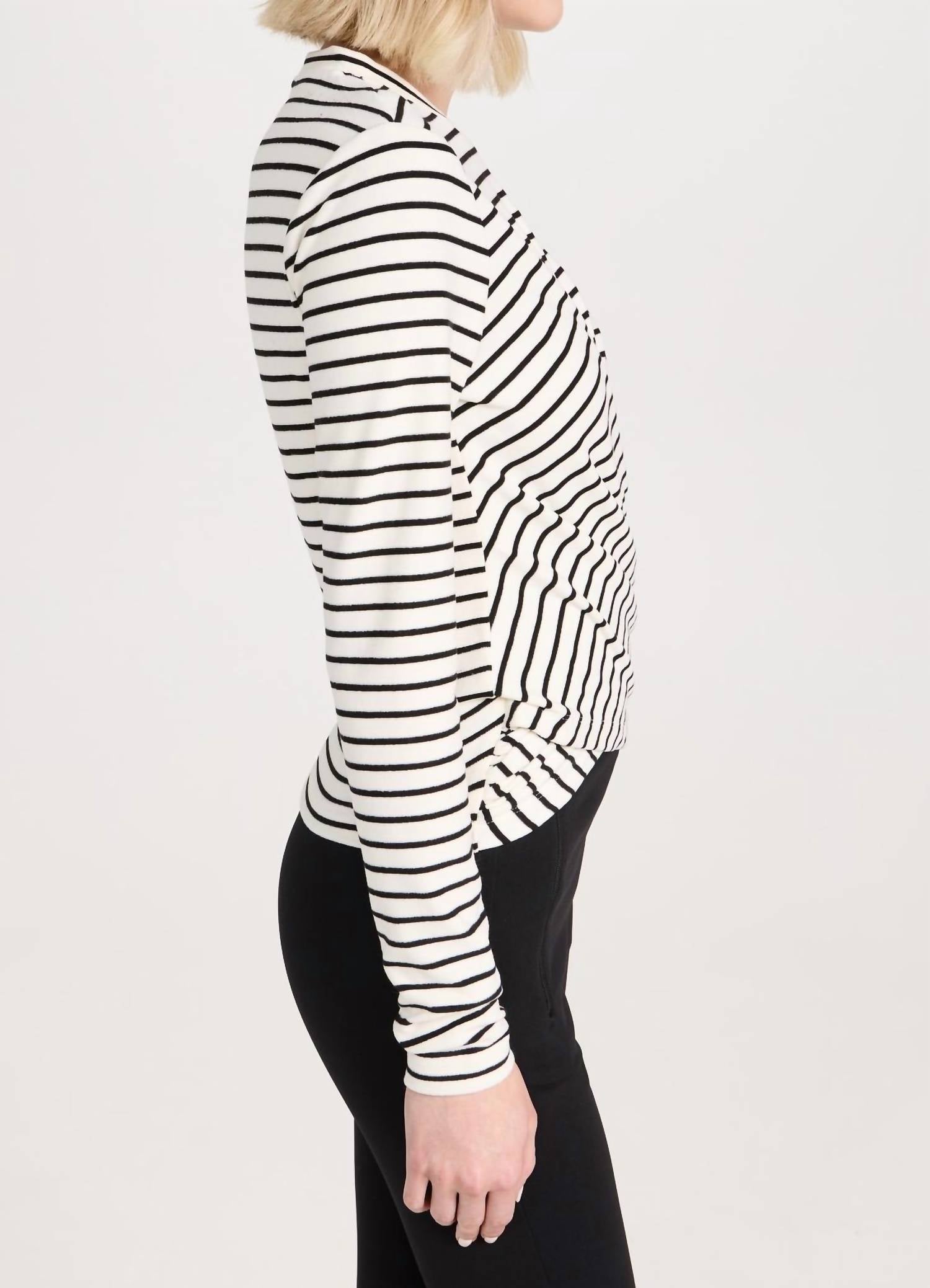 Great fit, cute design, soft fabric. You'll love everything about this long sleeve tee. This long-sleeve piece is crafted from a mid-weight ultra-soft fleece knit, featuring a classic round neckline and a gathered bodice with a striking Breton stripe pattern. Made from 95% polyester and 5% elastane, it offers an easy pull-on closure. This imported piece from China measures 21.25 inches in length. Machine wash cold.