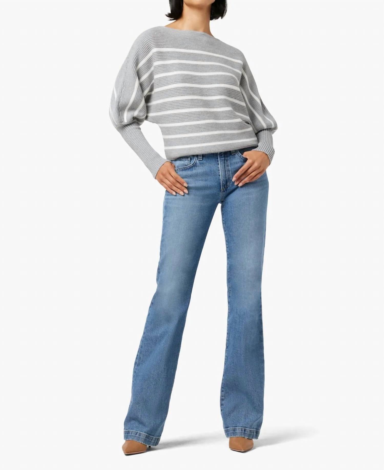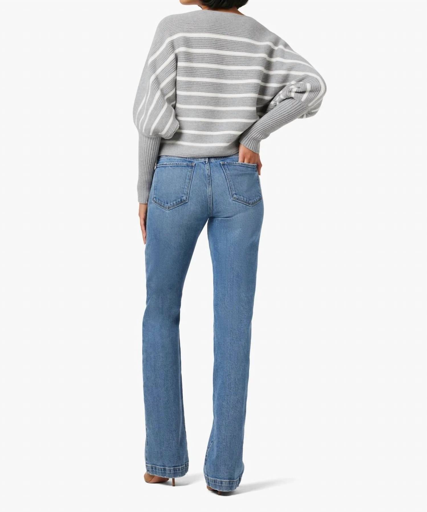 The ultimate go-to sweater, expertly crafted to provide the perfect combination of warmth and style. Its classic design and soft fabric make it a must-have addition to your wardrobe. Elevate your seasonal wardrobe with the Karina Crew Neck Long Sleeve Sweater by Joe's Jeans, a chic choice for travel and fall occasions. Crafted from a comfortable blend of 52% Viscose, 28% Polyester, and 20% Polyamide, this sweater features a flattering fit with fitted cuffs, slightly fuller sleeves, and a slightly cropped hem accentuated by stylish stripes. Presented in a versatile heather grey and white palette, it offers a preppy aesthetic perfect for Thanksgiving gatherings. Closure: Pull on. Care: Machine wash and lay flat to dry. Model is wearing a size small.