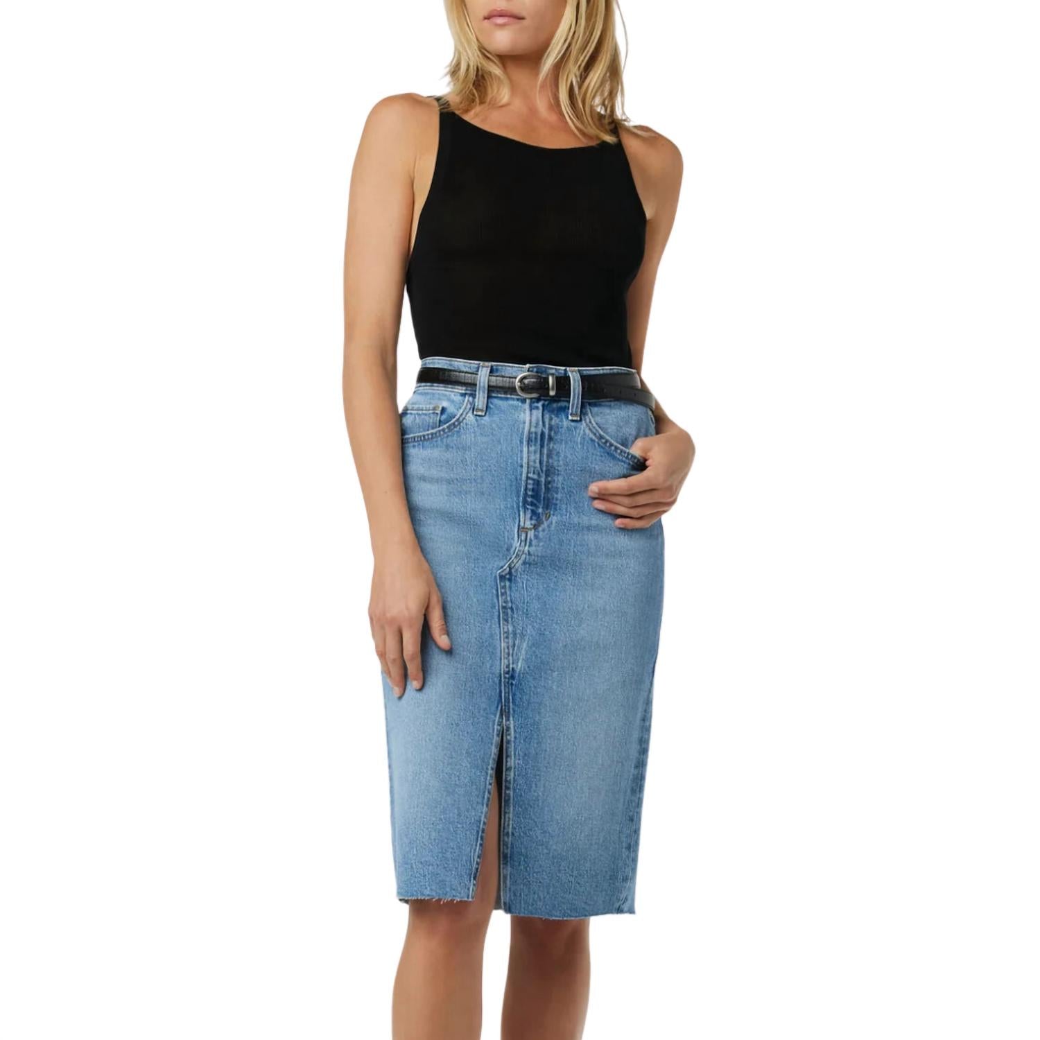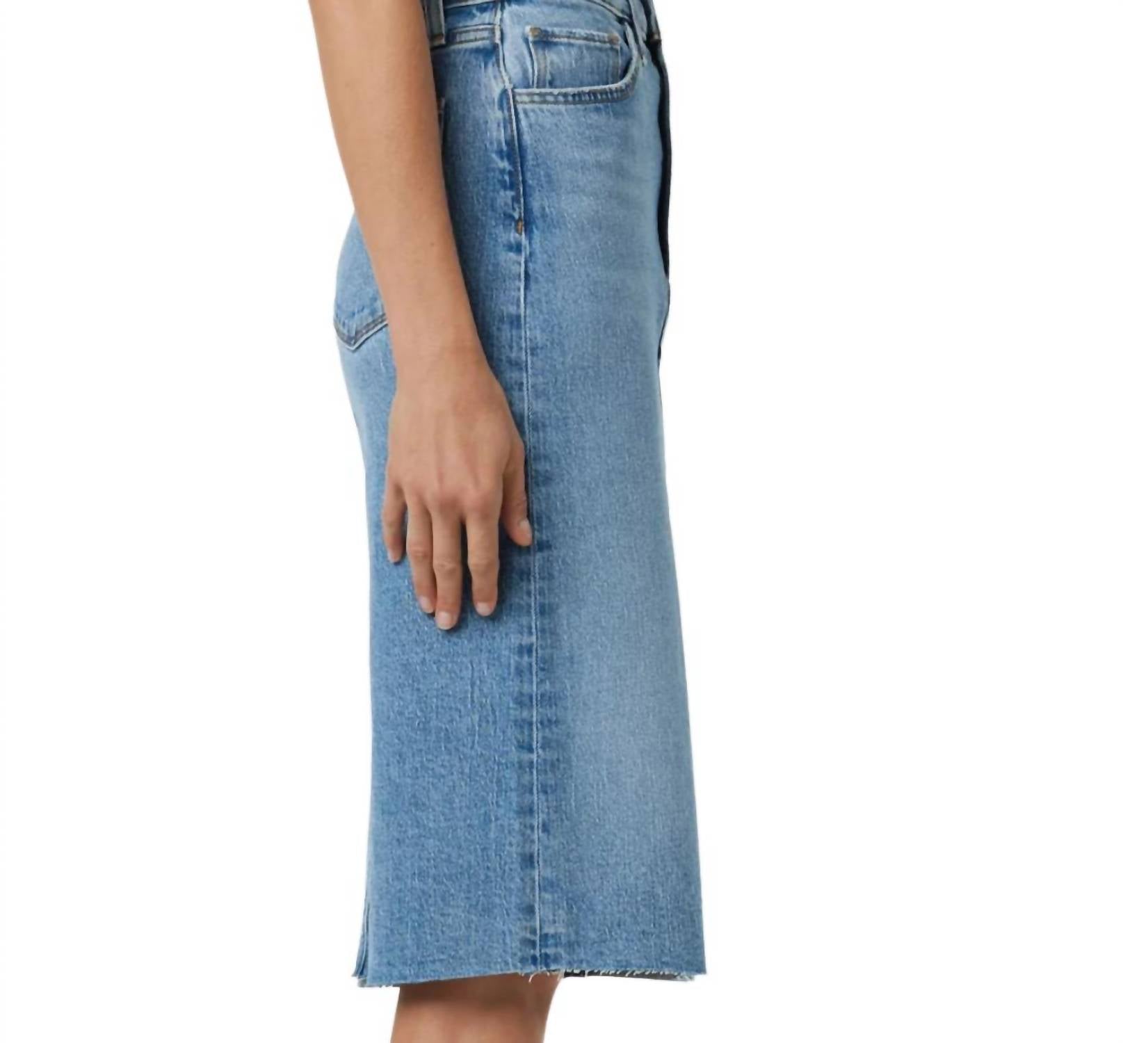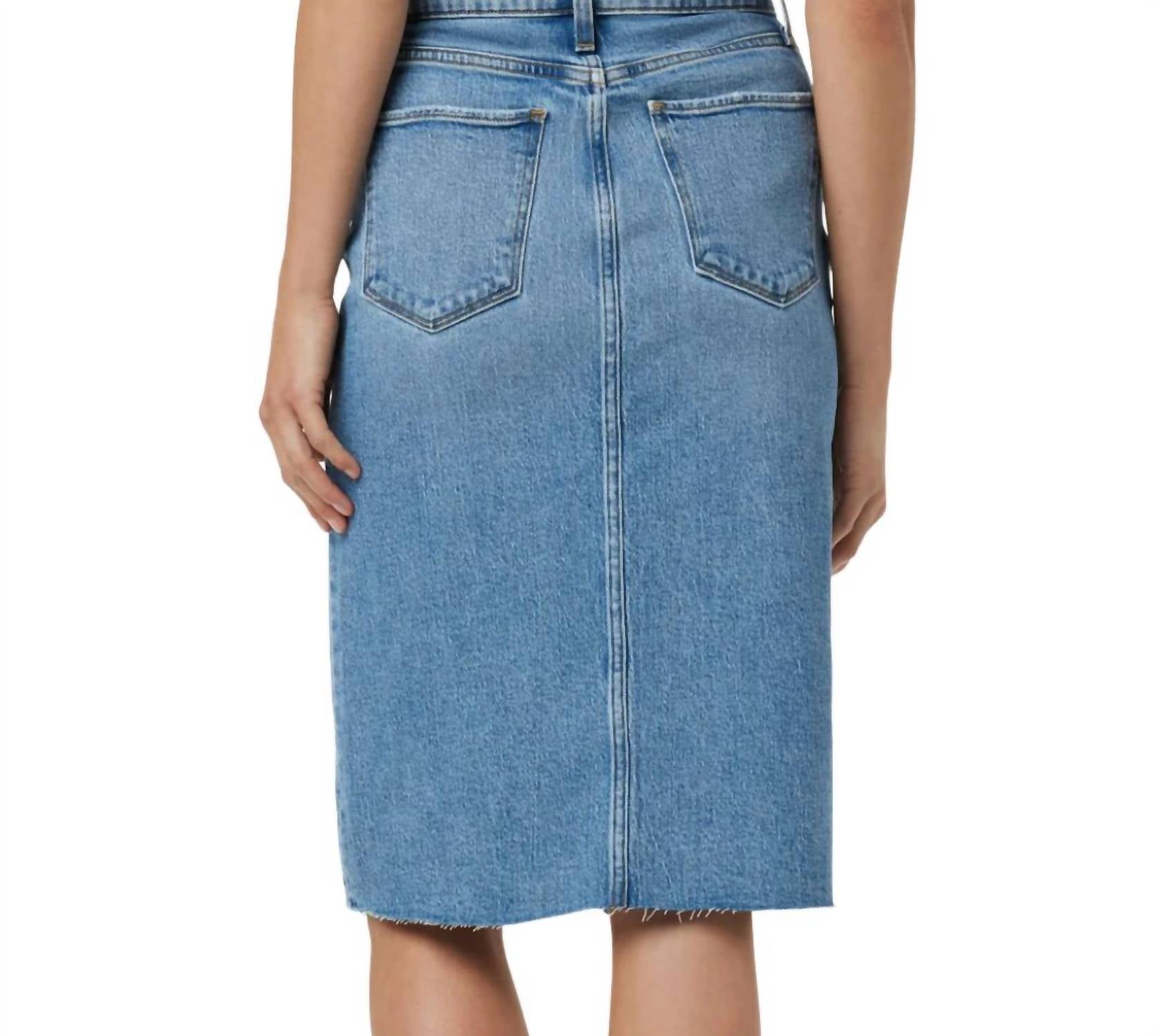 Tuck your favorite tee into this midi length skirt for an effortlessly cool look. Joes Jeans The Joplin Skirt Cotton, Lyocell, Elastane in Bad Habit Midi Skirt Medium-Light Heirloom Denim Comfort Stretch Raw Hem Straight Silhouette High Waist Front Vent Inseam 26.2” True to Size