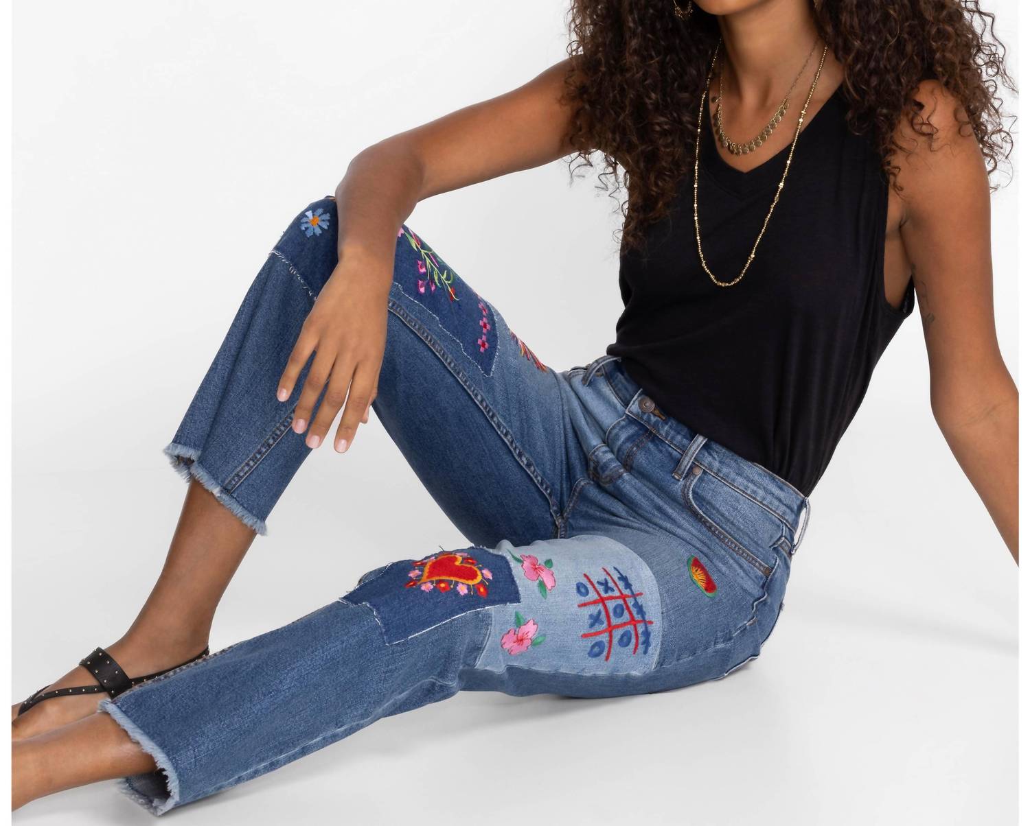Comfortable and stylish, we love this cropped jean for all of the obvious reasons. Introducing the Johnny Was Carmene Cropped Straight Jeans (model JWD1137) in medium wash. These jeans are made from a cotton blend with a hint of stretch, featuring a button and zip closure, decorative patches, and a cropped raw hem. They combine style and comfort, making them suitable for casual wear.