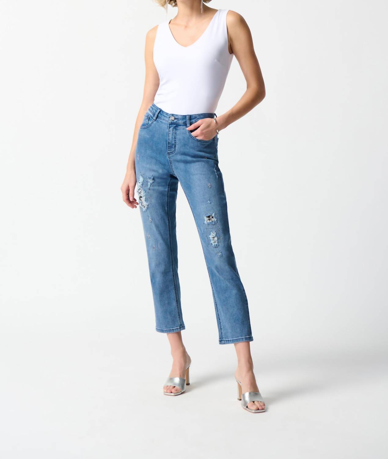 We especially love this cropped jean with a cute pair of slides or sandals. Add a touch of sparkle to your wardrobe with Joseph Ribkoff's Slim Fit Cropped Jeans in blue. Designed with medium wash denim, these jeans feature distressed detailing and bejeweled touches for a chic finish. Made from 72% Cotton, 23% Recycled Polyester, 3% Viscose Rayon, and 2% Spandex, they offer a comfortable mid-rise fit with a straight leg. Finished with a zip closure, these jeans require hand washing and line drying for care. The approximate inseam length for size 12 is 28 inches (71 cm).
