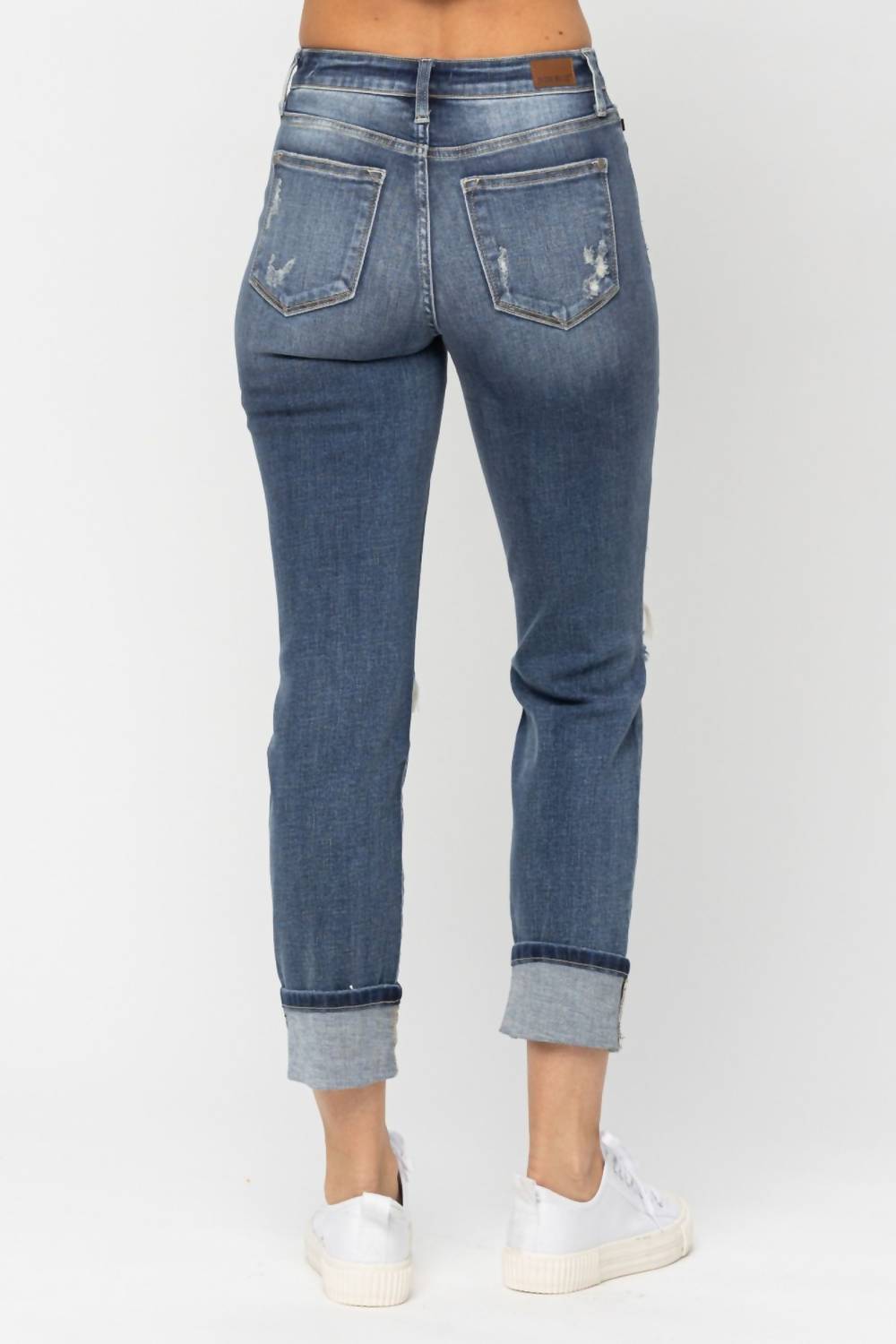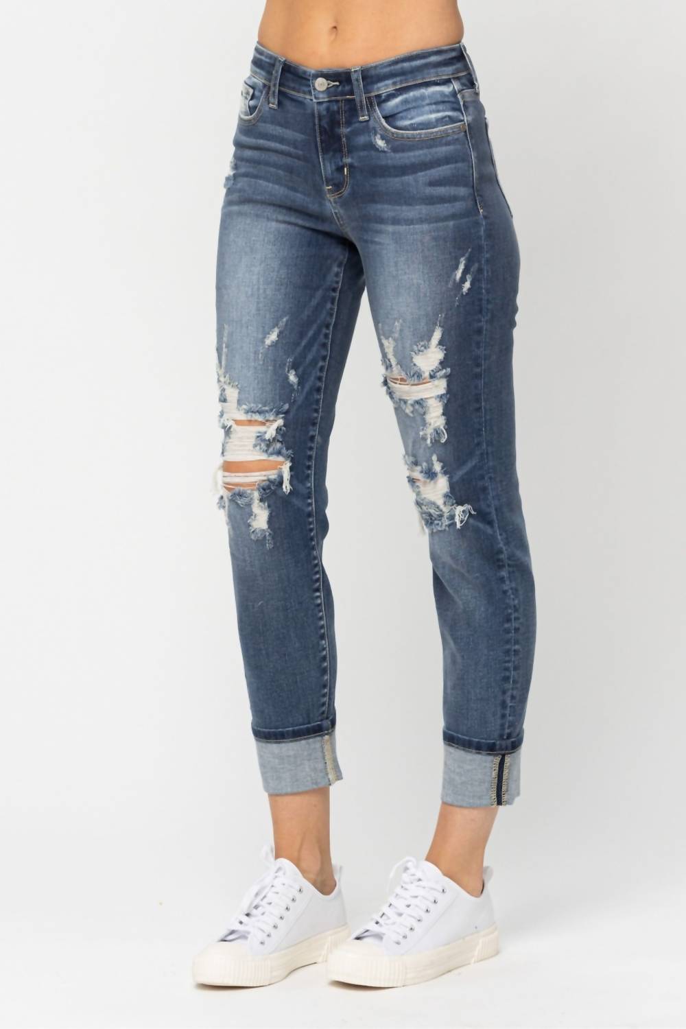 These must-have jeans are fit to perfection. Discover the Cuffed Destroy Boyfriend Jeans by Judy Blue, a chic addition to your denim collection. These straight leg jeans, crafted from a blend of 93% cotton, 6% polyester, and 1% spandex, offer a comfortable and flattering mid-rise fit with a rise of 9.75 inches. The design features a zip closure and functional pockets, with a 27-inch inseam that can be cuffed for a versatile look. Care is simple with machine wash and tumble dry instructions, making these dark wash jeans both stylish and easy to maintain.