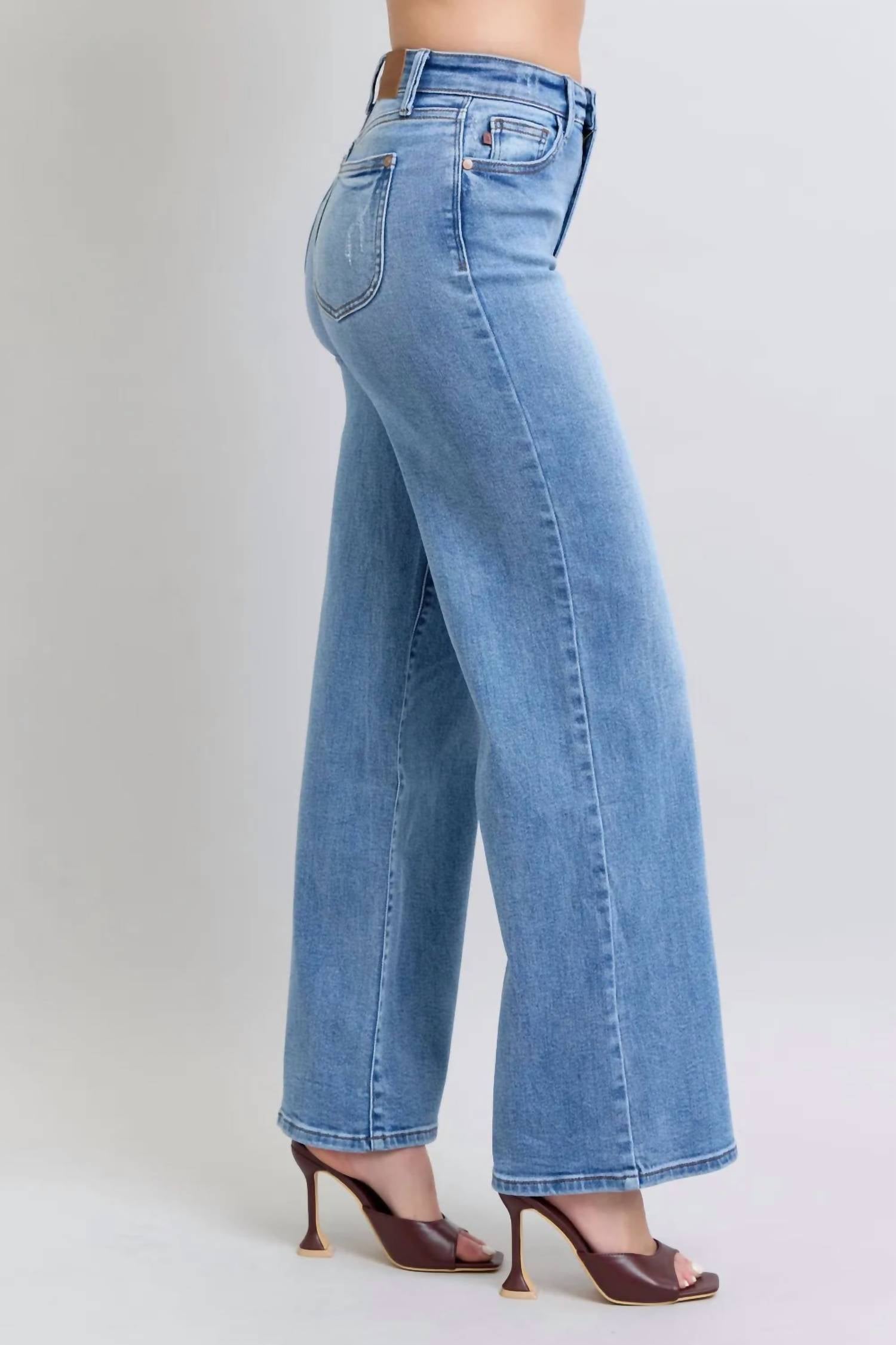 Step out in style with Judy Blue's Full Size Wide Leg Jeans With Pockets, perfect for a chic travel-ready look. Crafted from a durable cotton blend, these medium wash jeans offer a solid pattern and fashionable wide-leg cut. Highlighting a high-rise waist and button closure, they feature functional pockets for added convenience. Made in Vietnam, these jeans provide a moderate stretch and are easy to care for with machine wash and tumble dry low instructions. Ideal for spring outings, pair them with your favorite blouse for a standout ensemble. Available in sizes with a consistent inseam of 30 inches.