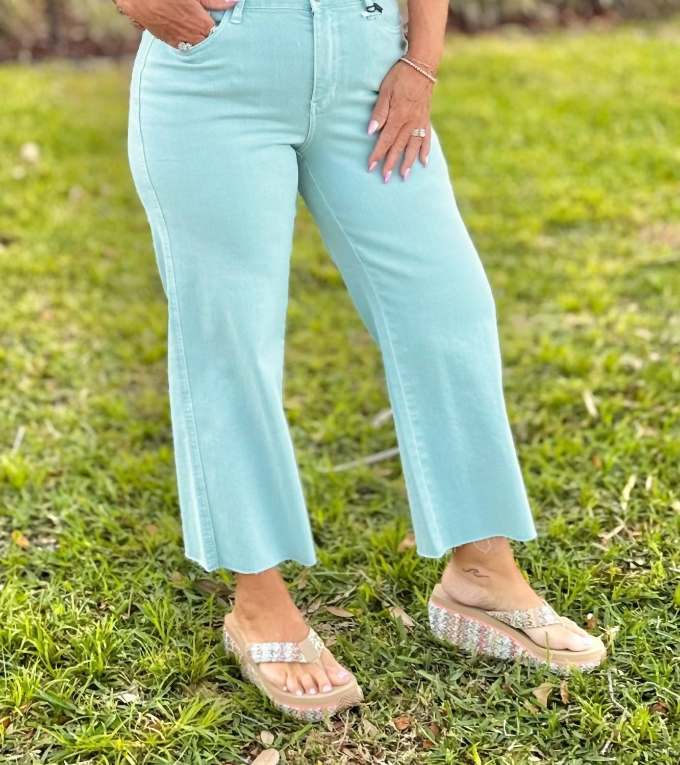 We especially love this cropped jean with a cute pair of slides or sandals. Elevate your spring wardrobe with the High Waist Crop Wide Leg Jeans by Judy Blue in a vibrant light blue sky hue. Crafted from a comfortable blend of 93% cotton, 6% polyester, and 1% spandex, these jeans feature a high-waisted fit with a relaxed, wide-leg style and a raw hem. Measuring a front rise of 10.75" and an inseam of 24.5", they offer a distinctive flair while ensuring comfort. Closure: Button closure. Care: Machine wash, tumble dry. Perfect for a standout look, these jeans effortlessly transition from a preppy brunch to a stylish baby shower occasion.