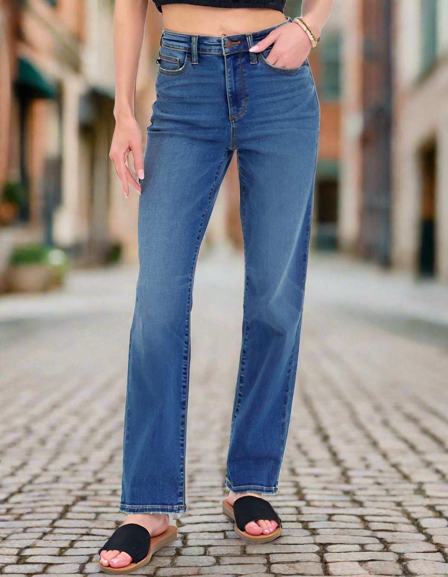 Judy Blue presents the High Waist Straight Jeans, a stylish pair crafted in a medium wash for a timeless look. These jeans feature an impressive front rise of 11 inches and an inseam of 30 inches, perfectly complementing the high-rise fit for comfort and style. Made from a cotton blend of 67% cotton, 20% rayon, 13% polyester, and 2% spandex, they provide excellent stretch and durability. Designed with a straight leg and functional five-pocket style, these jeans are finished with a button closure and are machine washable for easy care.