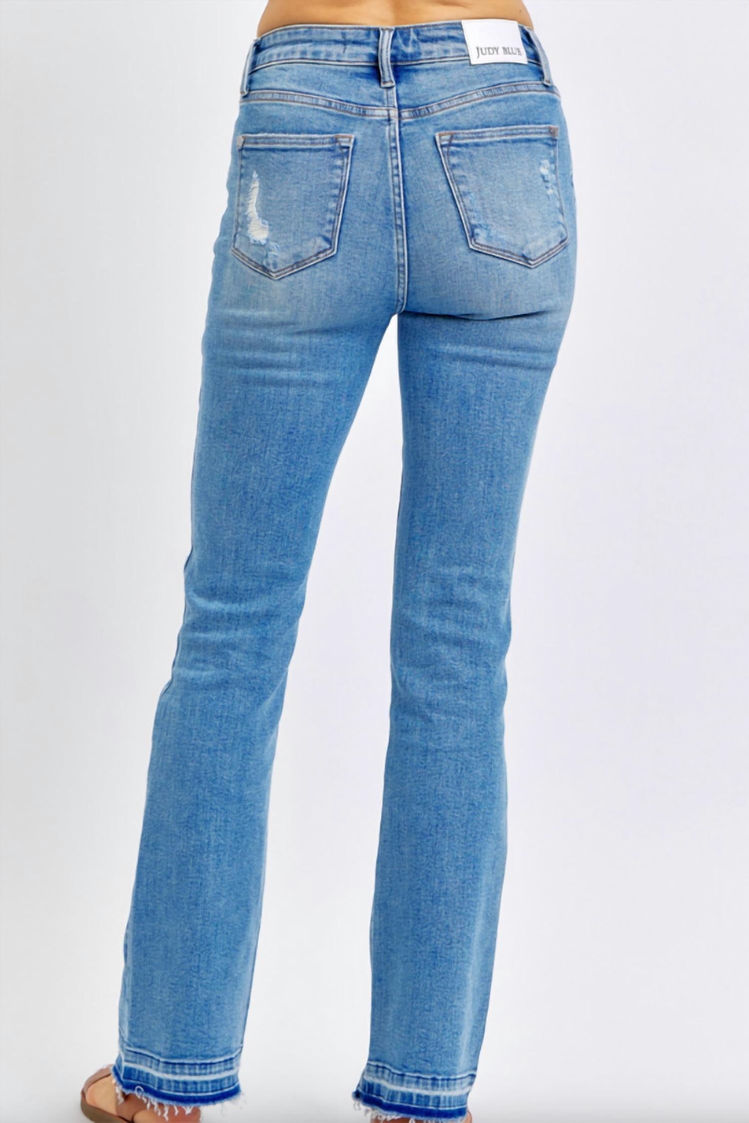 A boot-cut jean that not only looks good on, you'll be comfortable in them all day. Discover the Judy Blue Mid Rise Bootcut Jeans, designed for comfortable style in a light wash with slight distressing on the knee. Composition: 94% Cotton, 5% Polyester, 1% Spandex. These jeans feature a front rise of 10" and a flattering bootcut leg style. Closure: Button with pockets. Ideal for achieving a trendy, relaxed look with a hint of rugged charm.