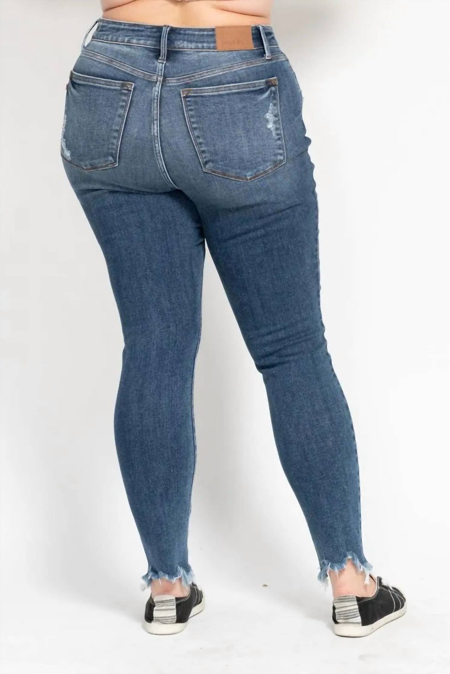 Tuck your favorite tee into these high-waist jeans for a more casual-cool feel. Introducing the Judy Blue Plus Size Hi Waist Skinny Shark Bite Hem Jean, a distinctive addition to your wardrobe that merges style and comfort seamlessly. Featuring a high-rise waist for a flattering fit, these jeans are crafted from a cotton blend (93% Cotton, 6% Polyester, 1% Spandex) that offers slight stretch. The skinny leg and unique shark bite hem add an edgy touch, perfect for streetwear and concert occasions. Closure: Zip closure. Care: Machine wash cold, tumble dry low. Ideal for women who love a modern twist on classic denim.