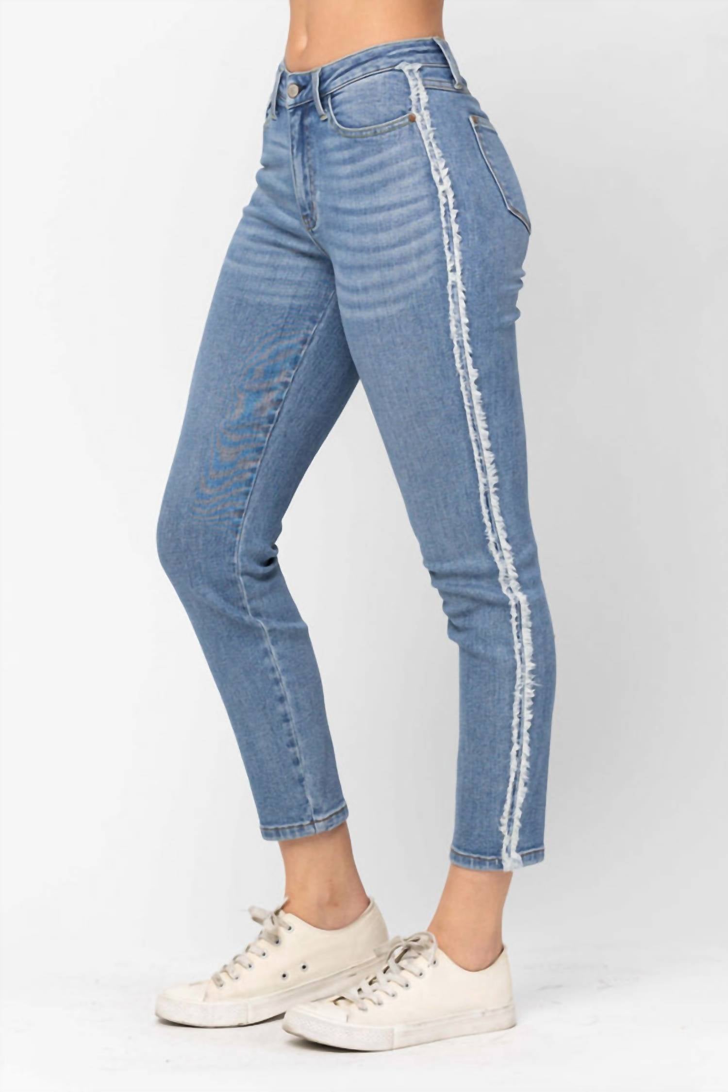 High Rise Skinny Jeans. Slim Fit. An adorable Fray detail all down the side seam on both legs. 100% Cottom. Machine wash cold. Made in USA.