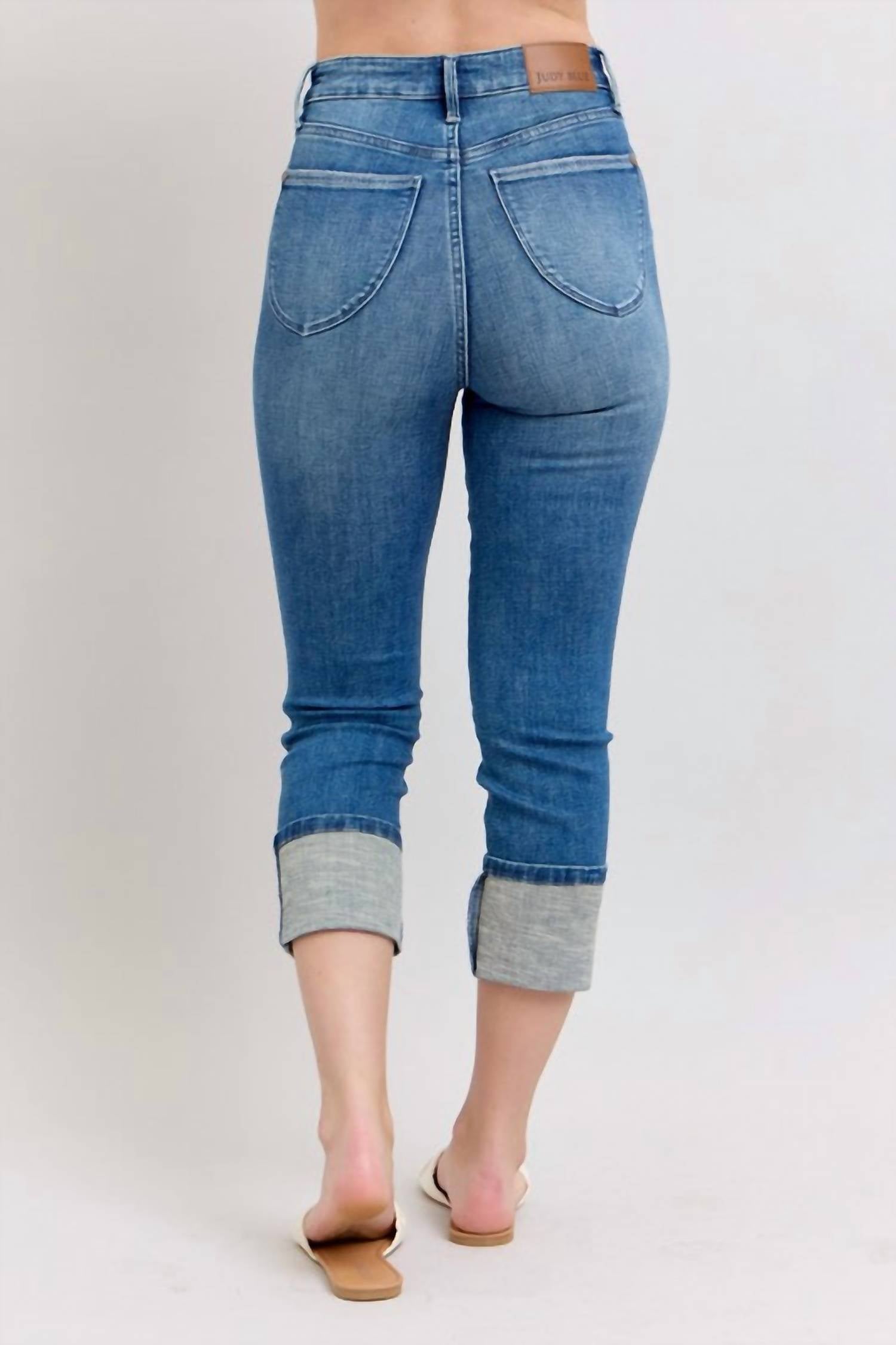 Everyone needs a good pair of skinny jeans and this is a style you'll keep reaching for no matter the season. The Skinny Cuff Capris Jeans by Judy Blue offer a chic, flattering style for a casual look. Designed in a medium wash, these jeans feature a high rise with a 27-inch inseam, and they are fitted through the legs, ending in a cuffed hem. Composed of 91.4% cotton, 7.4% polyester, and 1.2% spandex, they provide slight stretch for comfort. Button closure. Machine wash cold, tumble dry low. Available in a range of sizes, these jeans are imported and suit various occasions with their pocketed, solid design.