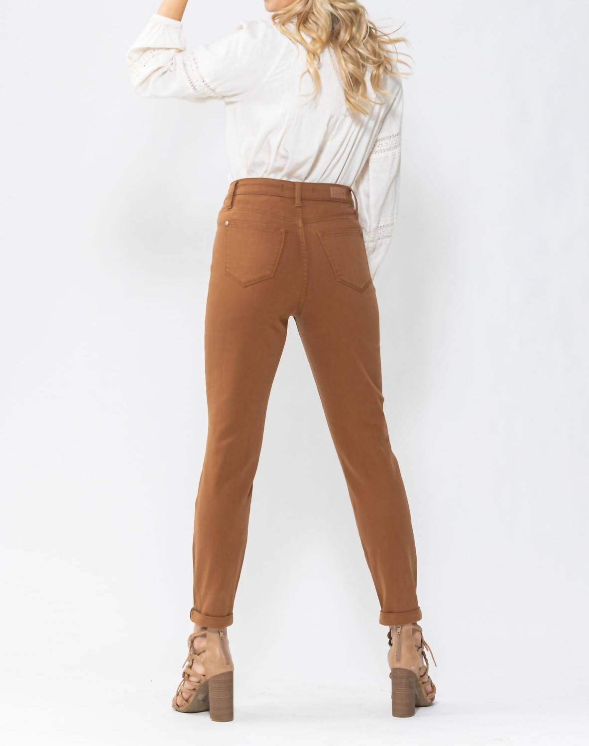 The perfect skinny jeans to wear with your favorite boots this season! Elevate your style with the Judy Blue Brown Slim Fit Jeans, expertly designed for a flattering silhouette. These jeans feature a regular fit with a skinny leg style and a high-rise of 10 3/4" for added comfort and style. Made from a blend of 93% cotton, 6% polyester, and 1% spandex, they ensure an ultra-soft feel and stretchy fit. With a zip closure and inseam options of 27" cuffed and 29" uncuffed, these jeans are a versatile addition to your wardrobe.