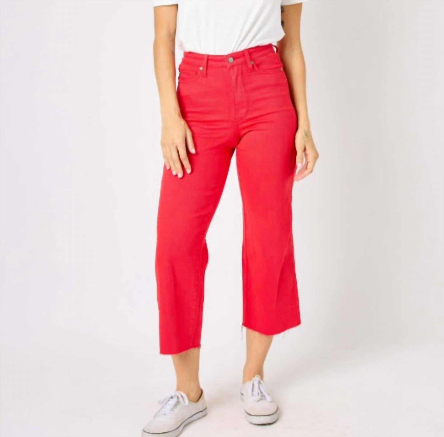 High-waist is here to stay and we especially love this style. Elevate your wardrobe with the Tummy Control Cropped Wide Leg Jean from Judy Blue, a minimalist masterpiece in bold red. Designed with a comfortable high waist, these jeans offer a relaxed fit and feature a timeless wide leg style. Crafted from a blend of 93% Cotton, 6% Polyester, and 1% Spandex, they provide the perfect balance of comfort and stretch, with a button closure for ease. Rise: 11", inseam: 24 3/4". Care is easy with machine wash and tumble dry options.