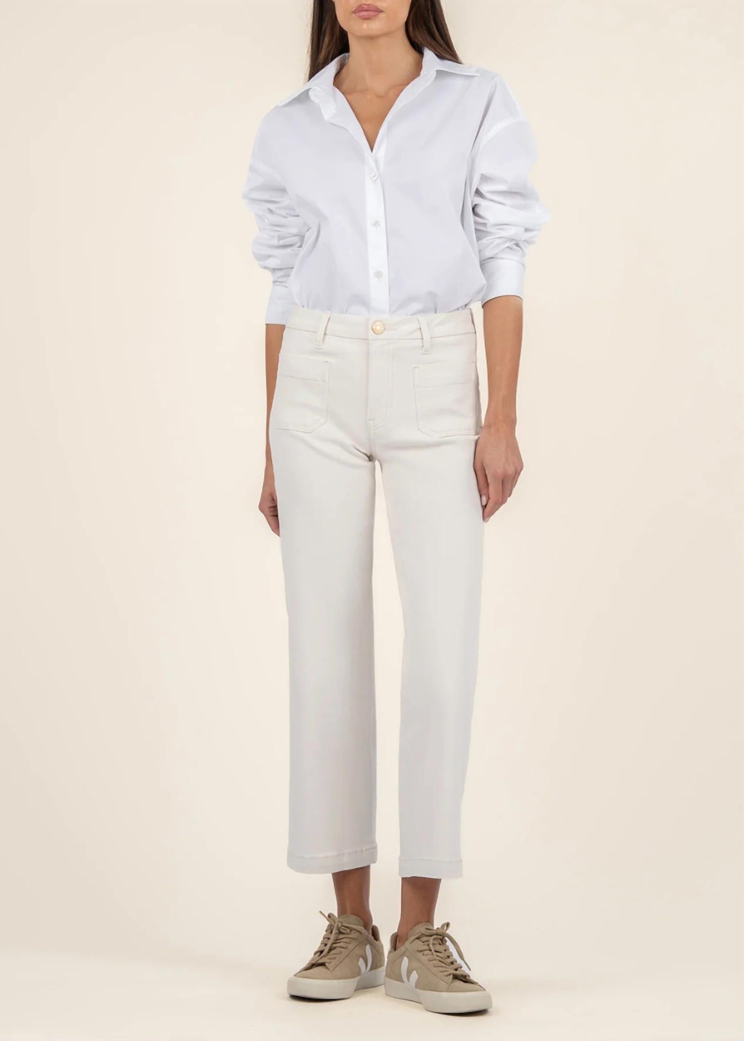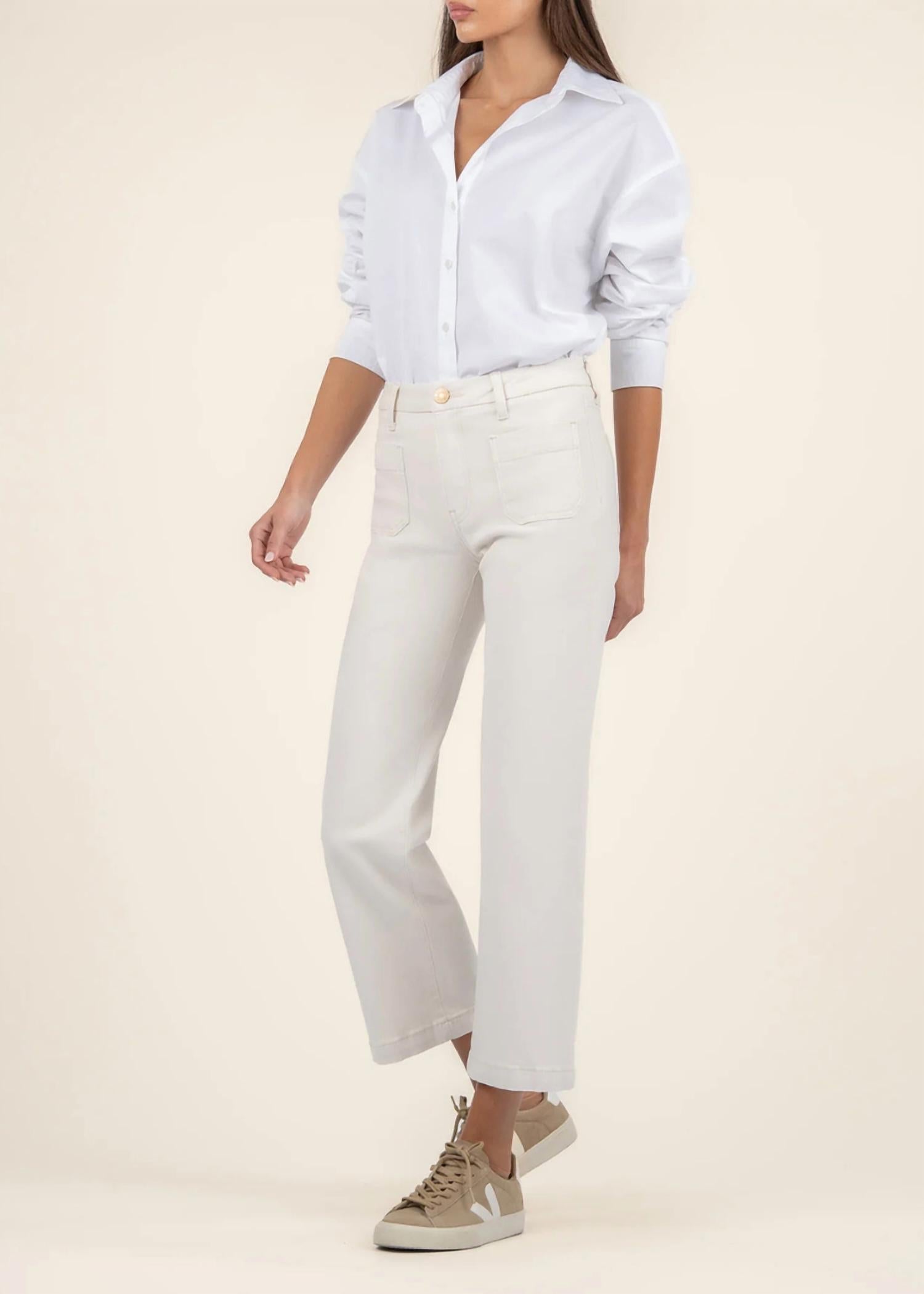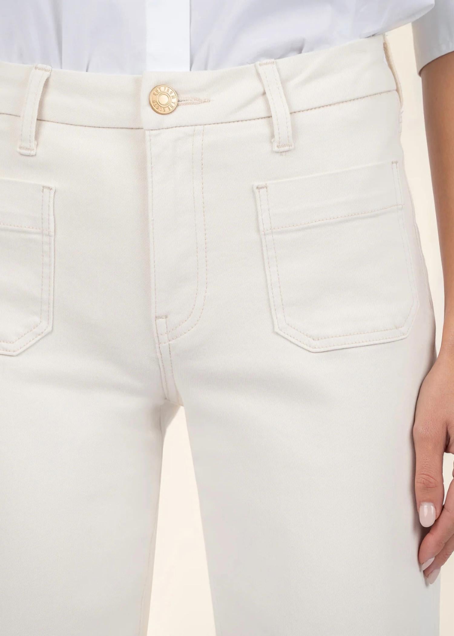 Tuck your favorite tee into these high-waist jeans for a more casual-cool feel. Elevate your wardrobe with the Charlotte High Rise Wide Leg Jeans by KUT FROM THE KLOTH, perfect for both dressy and casual settings. These ecru jeans feature a high-rise fit and wide leg design with chic patch pockets and a button closure. Crafted from a soft blend of 98% Cotton and 2% Spandex, they ensure a comfortable fit with a touch of stretch. Care: Machine wash. Dimensions include an inseam of 27", leg opening of 19", and a rise of 10". Model is 5'7" with a 26" waist and 35" hips, wearing size 0.