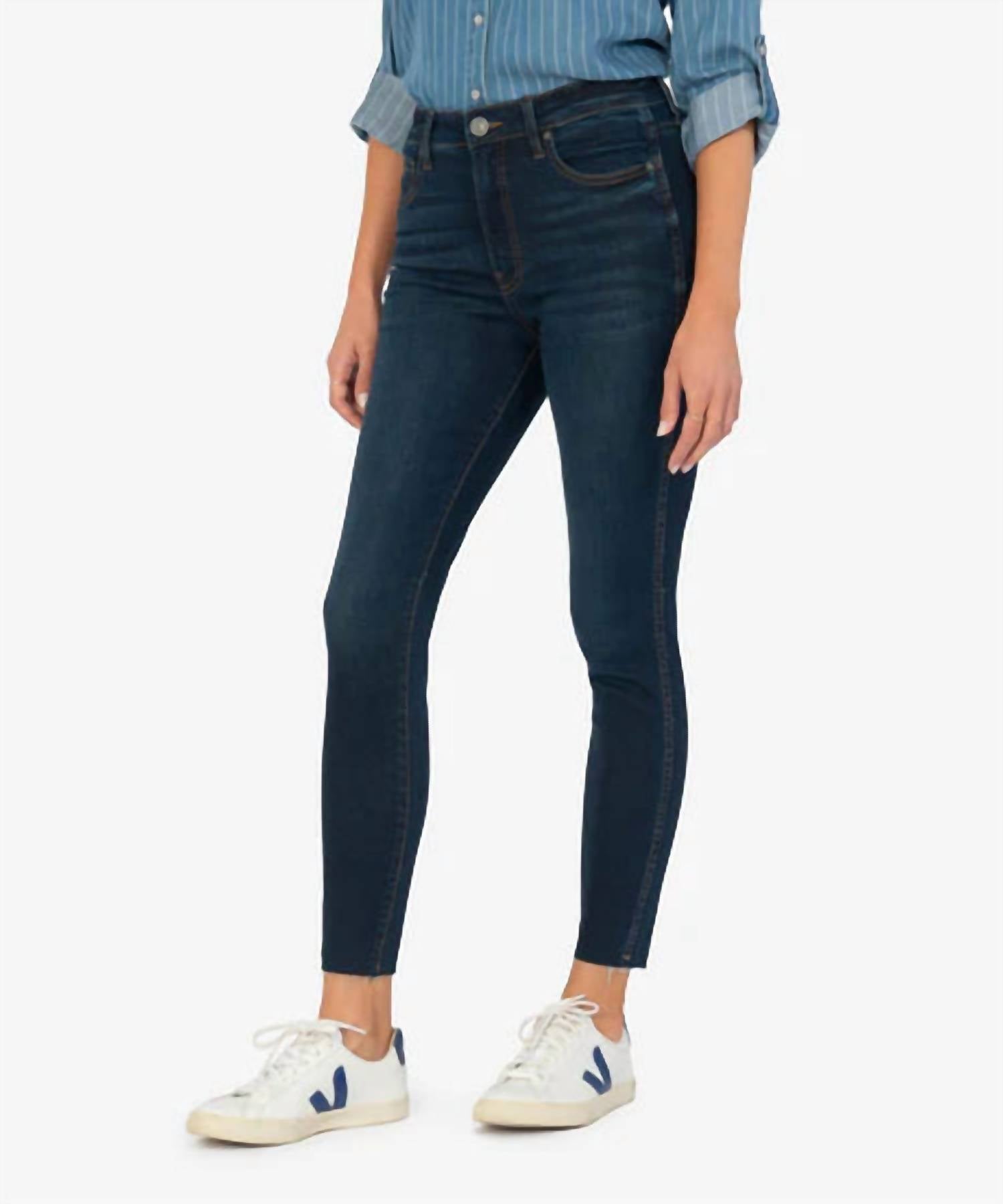 Tuck your favorite tee into these high-waist jeans for a more casual-cool feel. Introducing the Connie Ankle Skinny Jeans by KUT FROM THE KLOTH, a high-rise masterpiece crafted from a super stretch denim blend. Designed with a front pocket technique to provide a flattering and slender fit, these jeans boast a stylish raw hem and a deep indigo altered wash. Composition: 51% Cotton, 22% Polyester, 16% Lyocell, 10% Rayon, 1% Spandex. Closure: Zip closure. Care: Machine wash cold, tumble dry low. Size & Fit: Inseam 27", Leg Opening 9", Rise 10 1/4".