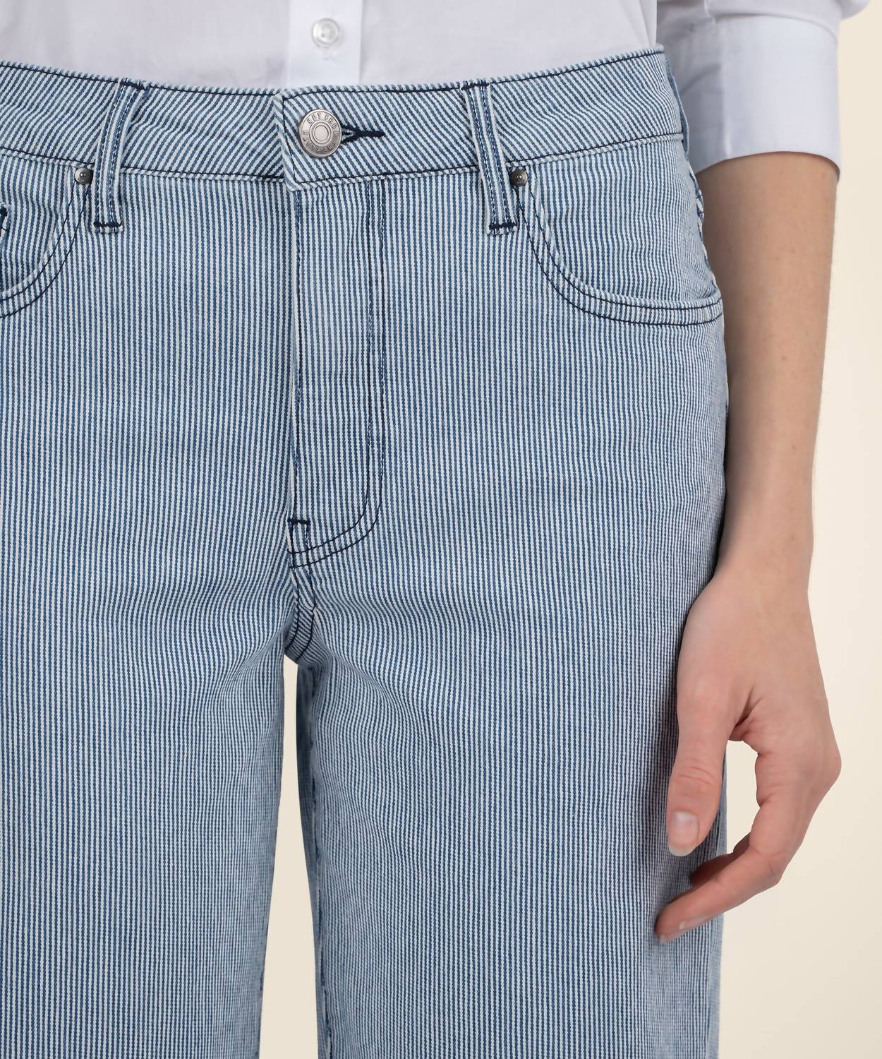 Pair these straight leg jeans with flats, sandals or even heels! You can't go wrong. Perfect blend of comfort and style with blue-white lawn striping. Feature a high rise and a playful roll-up detail that enhances their straight leg design. Crafted from 99% Cotton and 1% Spandex. Promise a flattering fit with a 28" inseam after roll up, 32" before roll up, an 18" leg opening, and a rise of 10.5". Button Closure. Machine wash and tumble dry.