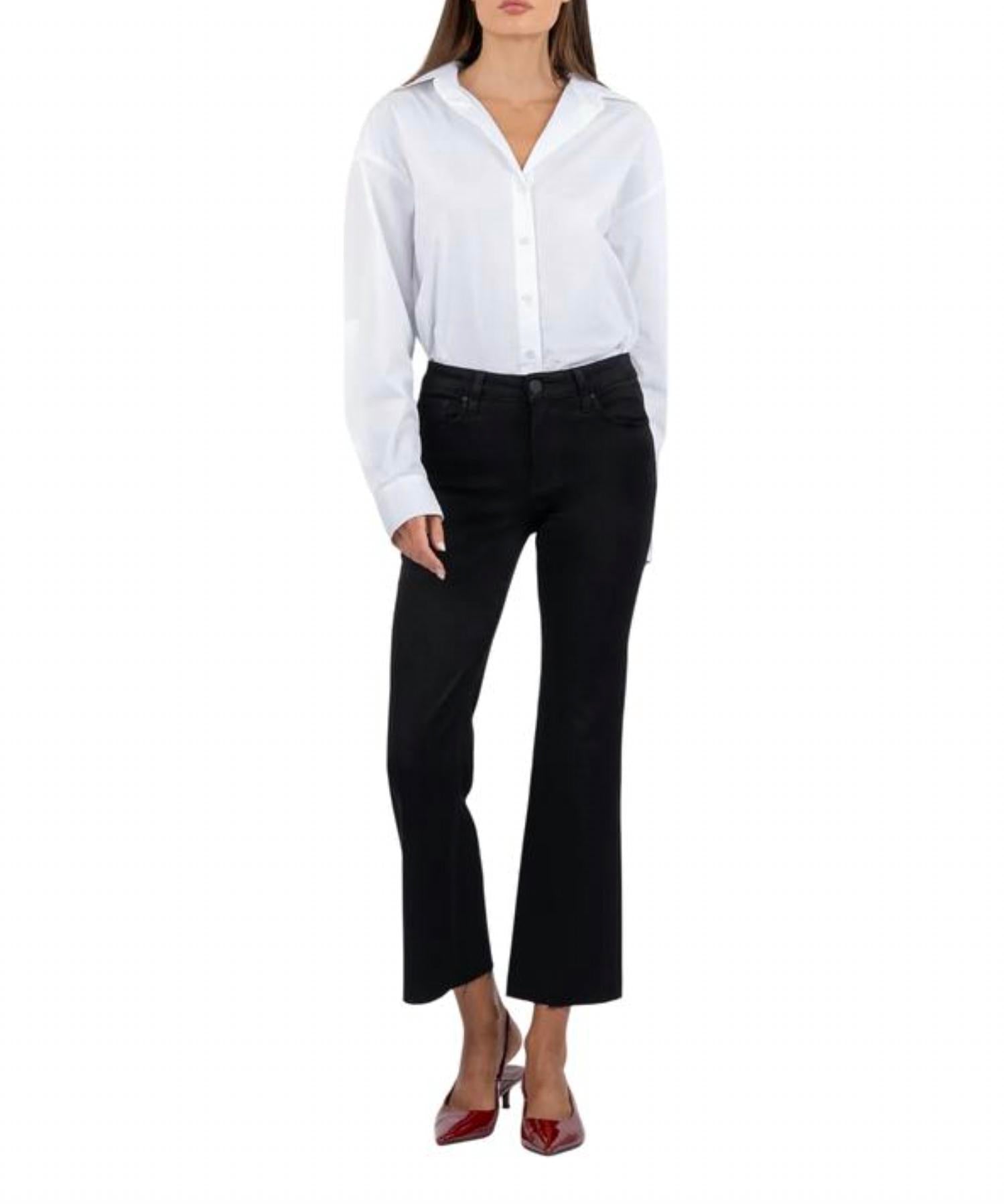 Comfortable and stylish, we love this cropped jean for all of the obvious reasons. The Kelsey Mid-Rise Ankle Flare Jeans by KUT FROM THE KLOTH bring together style and comfort in a versatile piece. With a modern flared leg and trendy inset detail, these ankle-length jeans feature a 28.25" inseam and a flattering 9.25" rise. Crafted from a blend of 35% Rayon, 34% Cotton, 30% Polyester, and 1% Spandex, they offer a soft, stretchy fit that moves with you while maintaining its shape. The classic black wash and raw-cut hems add an edgy, casual vibe, making them perfect for both day and night looks. Closure: Button. Care Instructions: Machine wash cold and tumble dry low.