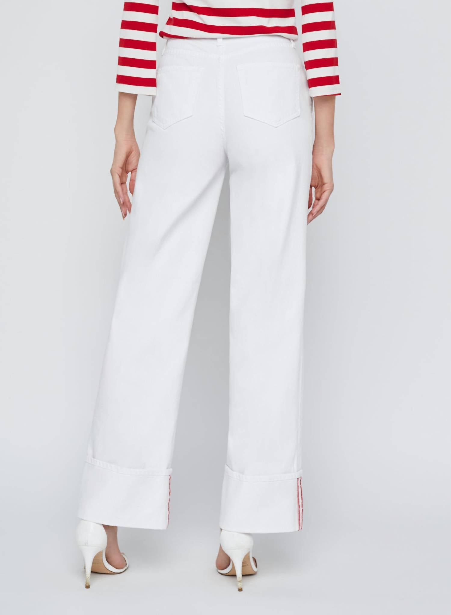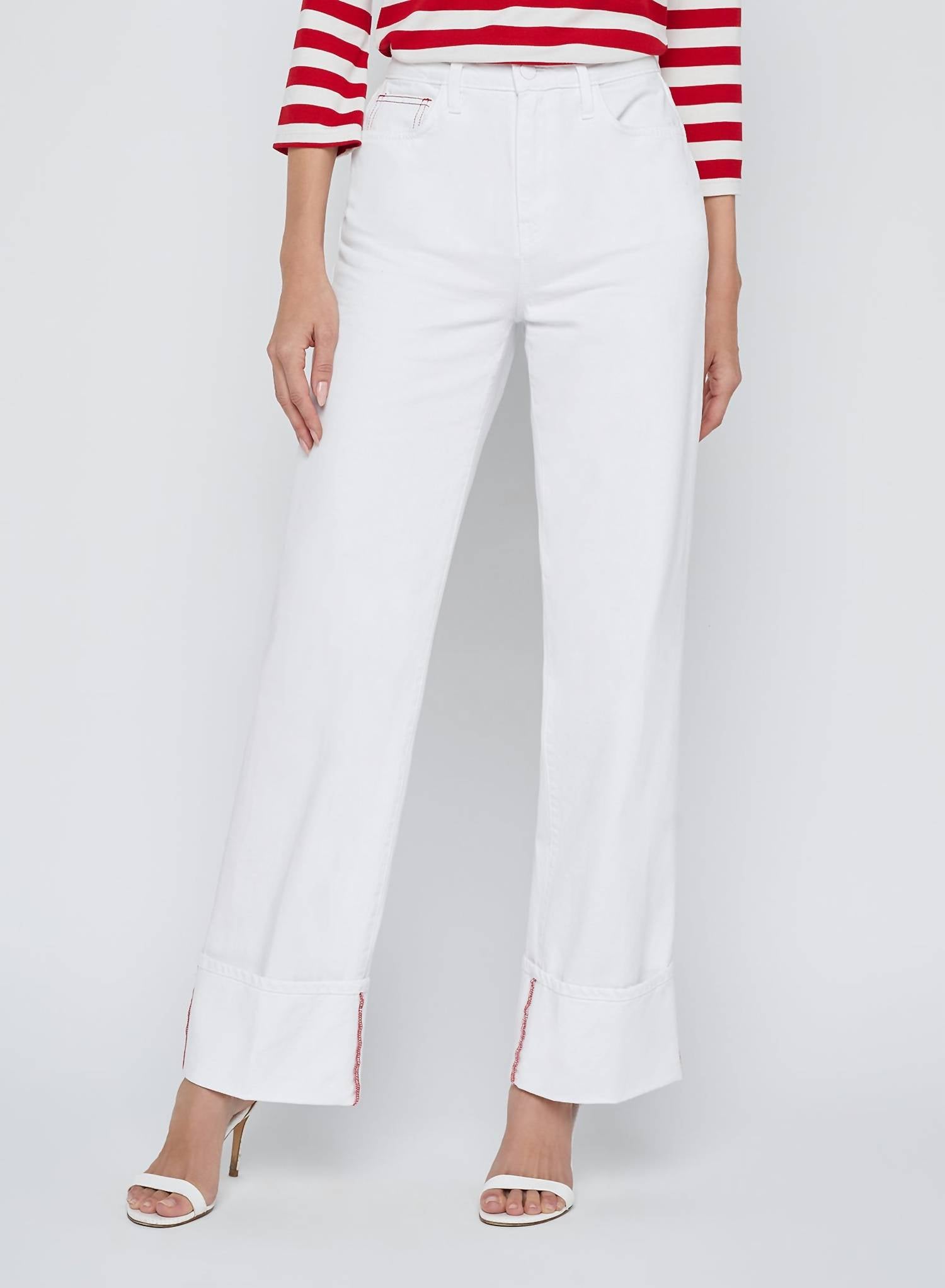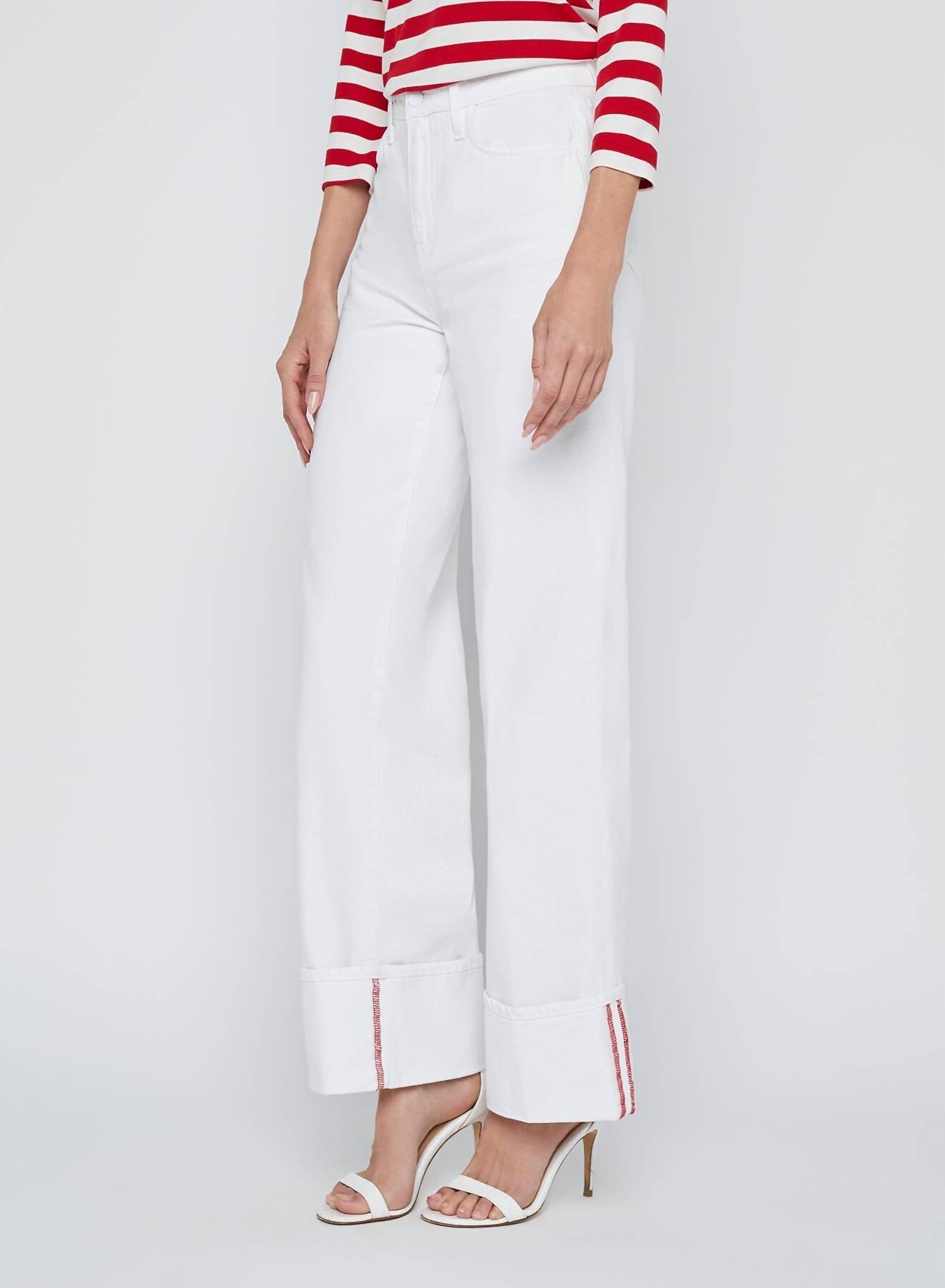 Tuck your favorite tee into these high-waist jeans for a more casual-cool feel. Elevate your wardrobe with the L'Agence Miley Ultra High Rise Wide Leg Cuff Jeans, crafted from 100% cotton for a comfortable yet stylish look. These jeans boast an ultra-high-rise and wide-leg fit, highlighted by a chic cuffed hem and striking red stitching that punctuates the blanc color. This premium denim offers a solid pattern and features a convenient button closure. Care is a breeze with machine wash and line dry instructions, making them a practical choice for effortless elegance.