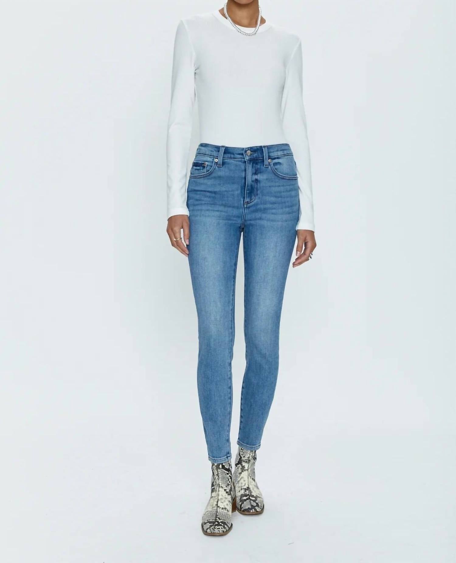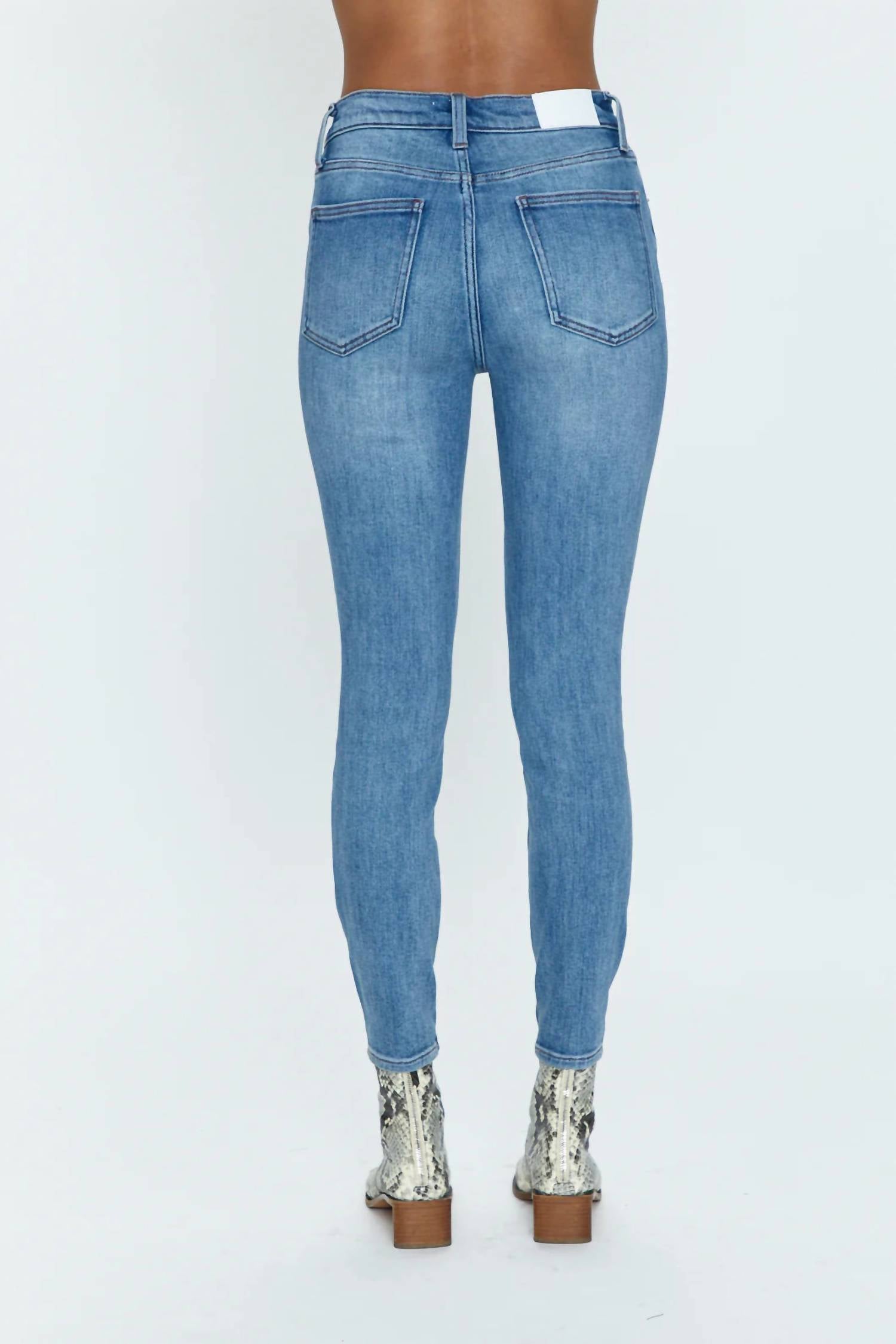 Everyone needs a good pair of skinny jeans and this is a style you'll keep reaching for no matter the season. Discover the Aline High Rise Skinny Jean by PISTOLA, a women's essential in seductive Linden. This textured, cotton blend denim features a classic skinny leg design with a flattering 10.5" high rise and a 28" inseam that contours to your curves. Offered in a medium blue wash, it showcases a lived-in aesthetic with subtle fading and light whiskering. Closure: Button closure. Care: Machine wash, tumble dry.