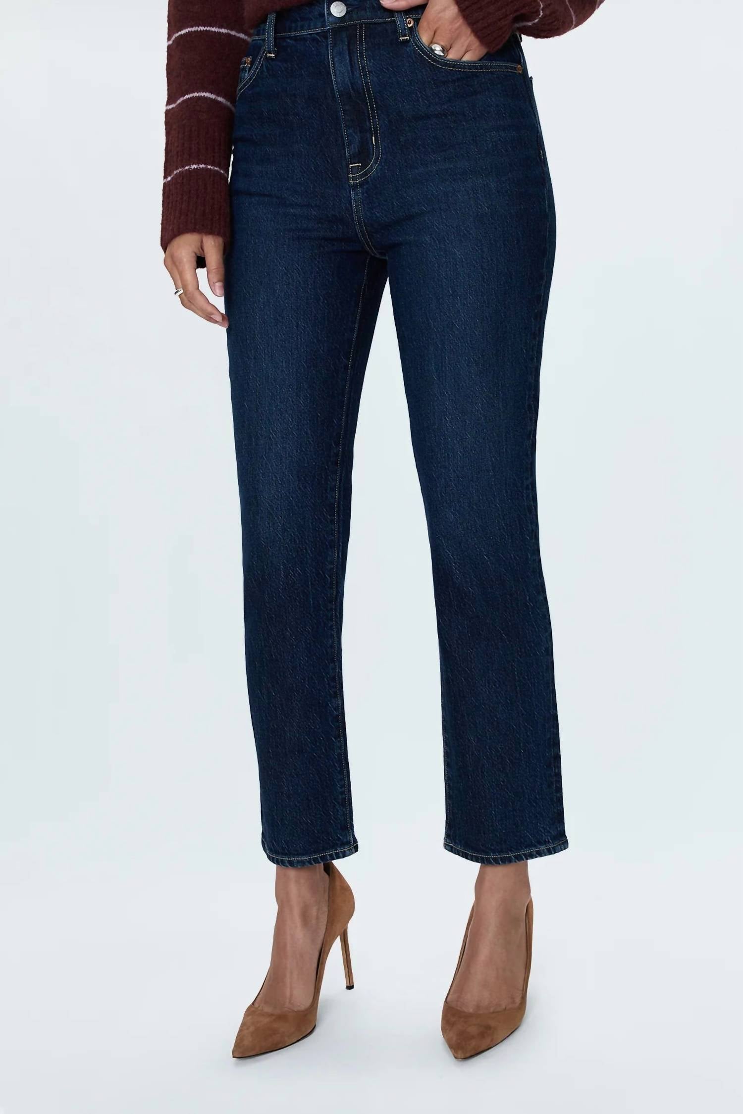 Pair these straight leg jeans with flats, sandals or even heels! You can't go wrong. Elevate your denim collection with the Bri High Rise Slim Straight Jeans by PISTOLA, offering a chic 'Focus' dark wash. These jeans boast a comfortable Cotton Blend fabric with an 11.5" rise and 28" inseam, ensuring a flattering and stylish fit. Designed with a straight leg and a solid pattern, they feature convenient pockets and a button closure for effortless wear. Care for them with ease through machine washing.