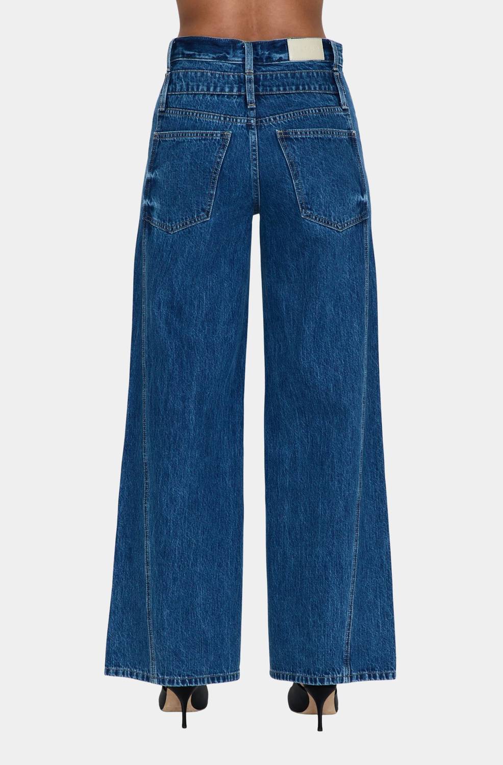 A flattering silhouette that's suprisingly versatile. Crafted for contemporary style with a high-rise, relaxed fit, and striking wide leg. Made from cotton. Medium blue denim is free of fading or distressing, featuring a unique double stacked waistband and elevated side seam details. Solid reflection color pairs seamlessly with any fall streetwear ensemble. Button closure. Care instructions include machine wash and tumble dry for effortless maintenance.