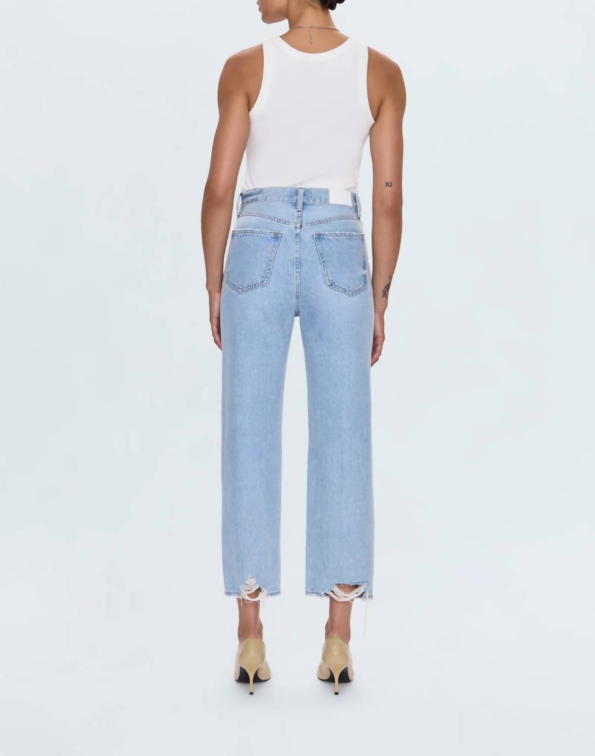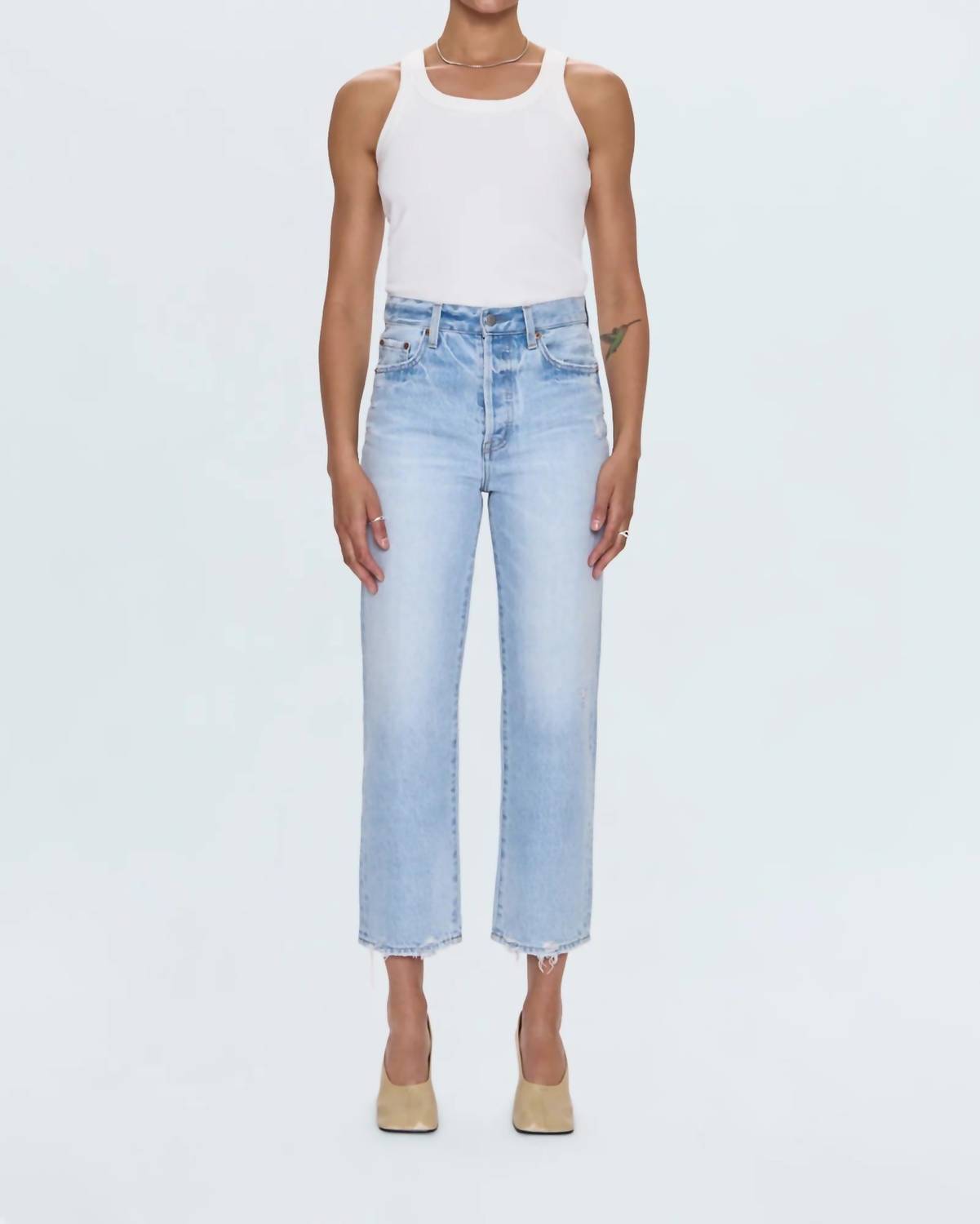Pair these straight leg jeans with flats, sandals or even heels! You can't go wrong. Presenting the Cassie Crop Super High Rise Straight Leg Jeans by PISTOLA—a statement piece in Radiant light wash denim designed for the modern wardrobe. These jeans feature a sleek relaxed fit with a super high rise of 12 inches and an inseam of 26 inches for an elongated silhouette. Constructed from a blend of 55% hemp and 45% organic cotton, they offer a durable yet stylish choice. Closure: Button closure; Care: Machine wash. Model is 5’9” wearing size 26, showcasing a straight leg cut perfect for any season.