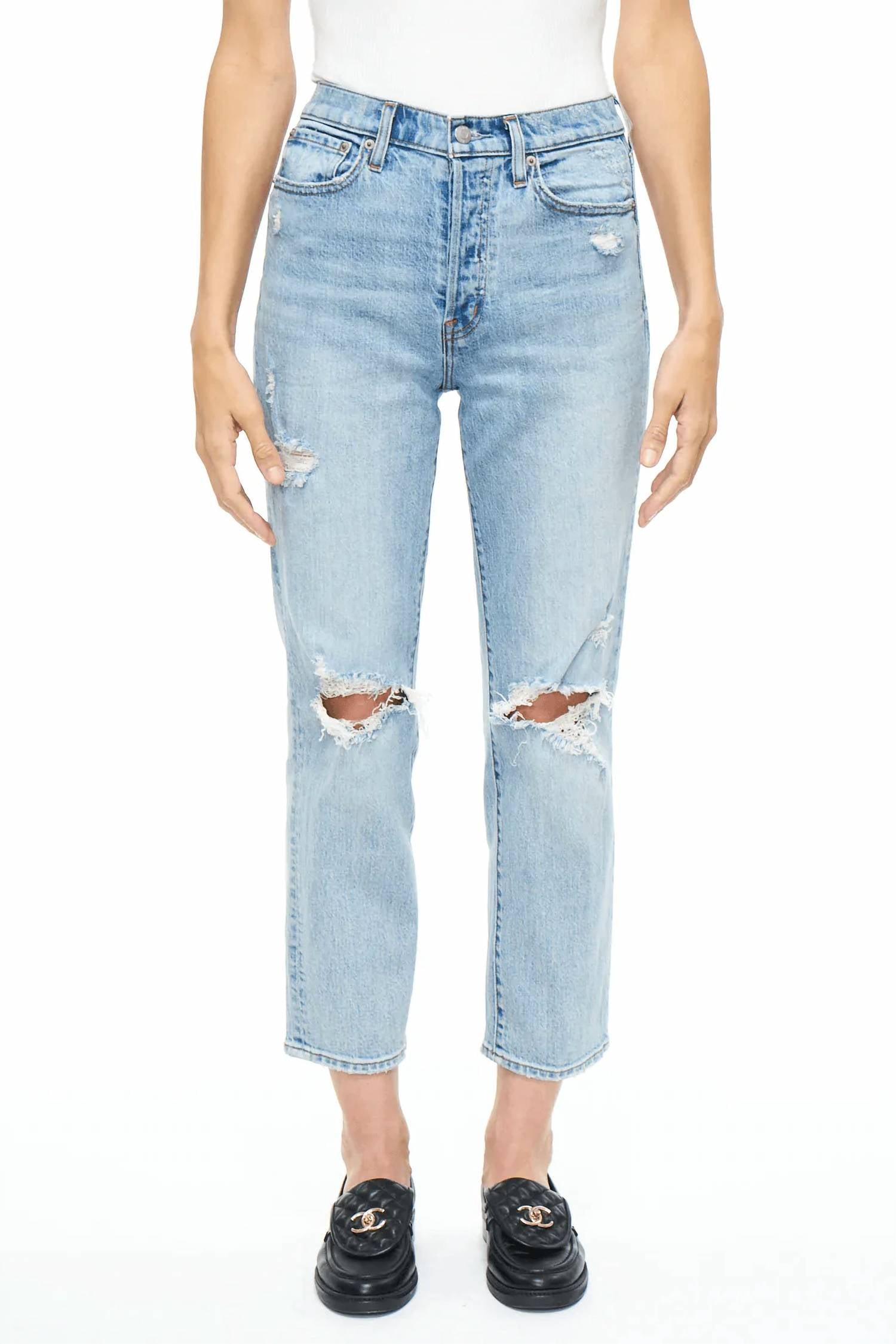 This classic straight leg jean has a perfect fit and goes with just about everything. High rise faded and distressed straight leg jean. Button fly. Five pocket construction. Materials: 65% Cotton 34% Organic Cotton 1% Elastane. Wash cold. True to size. Some stretch. All measurements taken from a size 26 - Rise: 11", Inseam: 27", Leg Opening: 14.5".