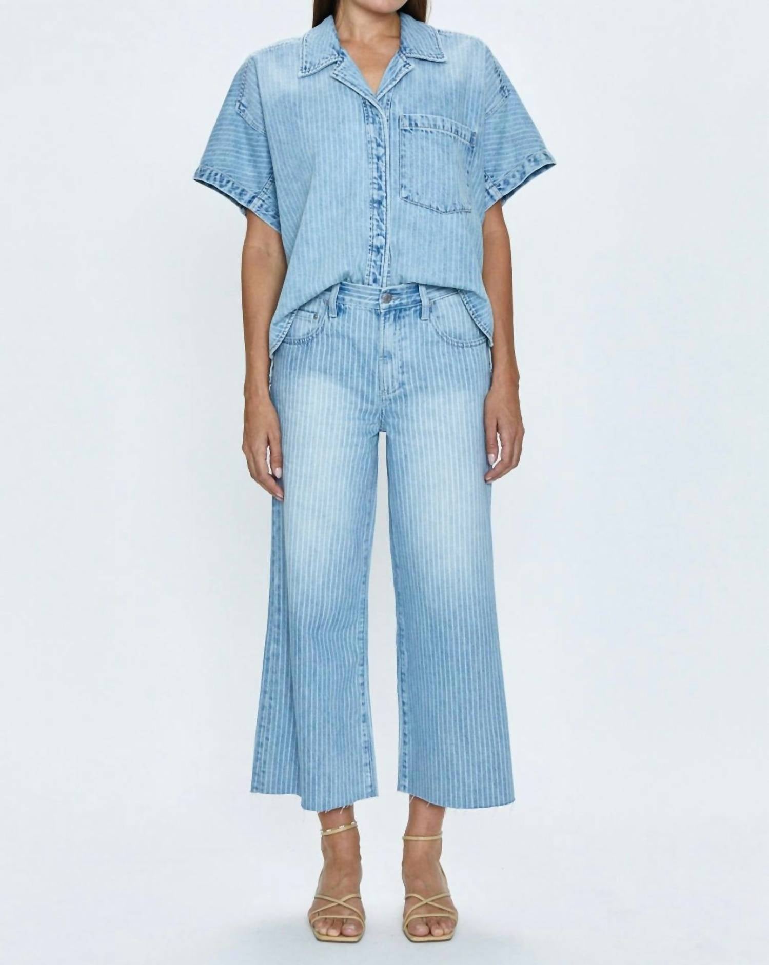 Just as cute as they are comfortable. Chic choice for your streetwear collection. Low-rise jeans feature a relaxed fit with a wide-leg silhouette, perfect for creating an on-trend look with their canopy stripe pattern. Made with 77% Cotton and 23% Rayon. Come in a light wash, complemented by vintage fading, whiskering, and laser striping. Closure is secured with a button. Easy to maintain with machine wash cold and tumble dry instructions.
