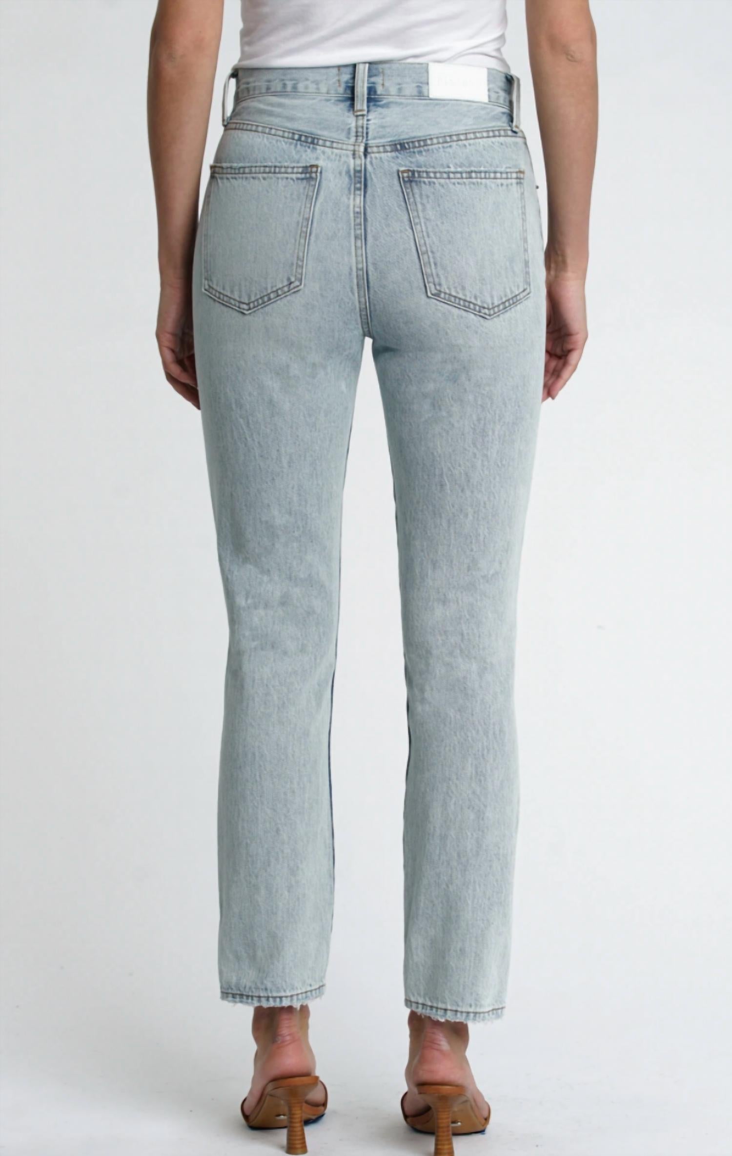 This classic straight leg jean has a perfect fit and goes with just about everything. 100% Cotton. The Keaton is a super high rise slim straight jean that hugs your waist, fits closely to your legs and hits right above the ankles. This figure flattering light-wash style features a hidden button fly. Rise: 11 1/2" | Inseam: 28" | Leg Opening: 13". All measurements taken from a size 26. Wash cold. Imported