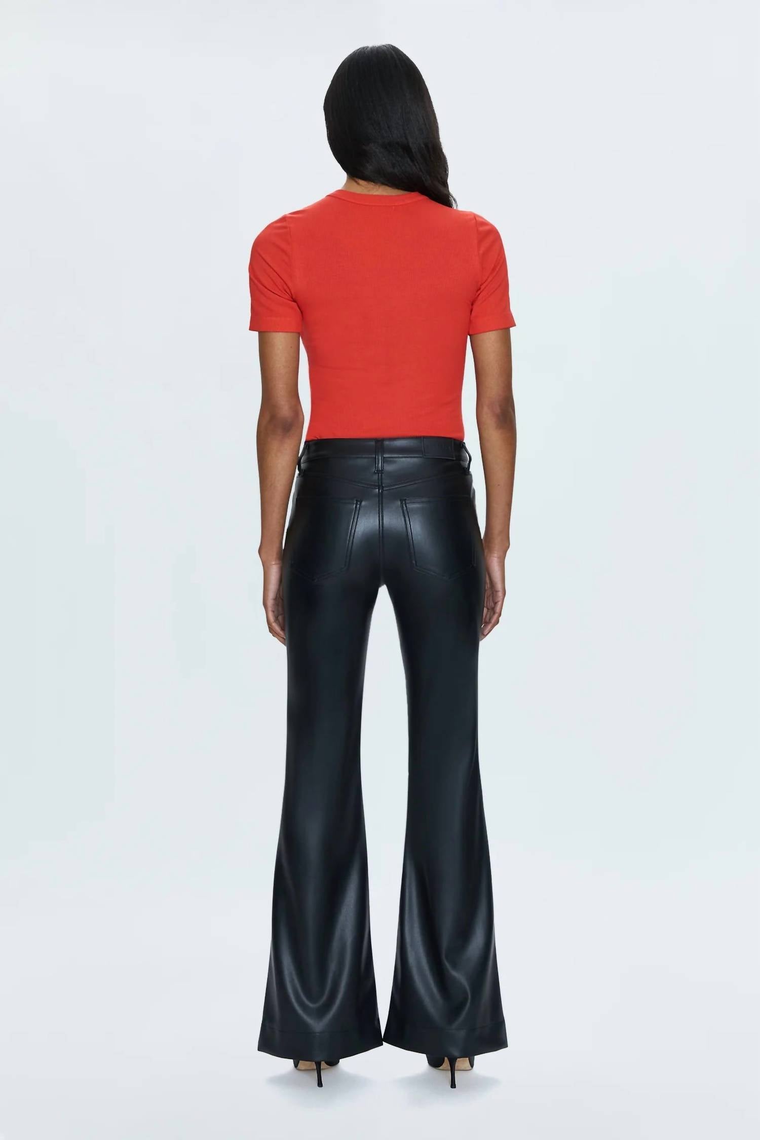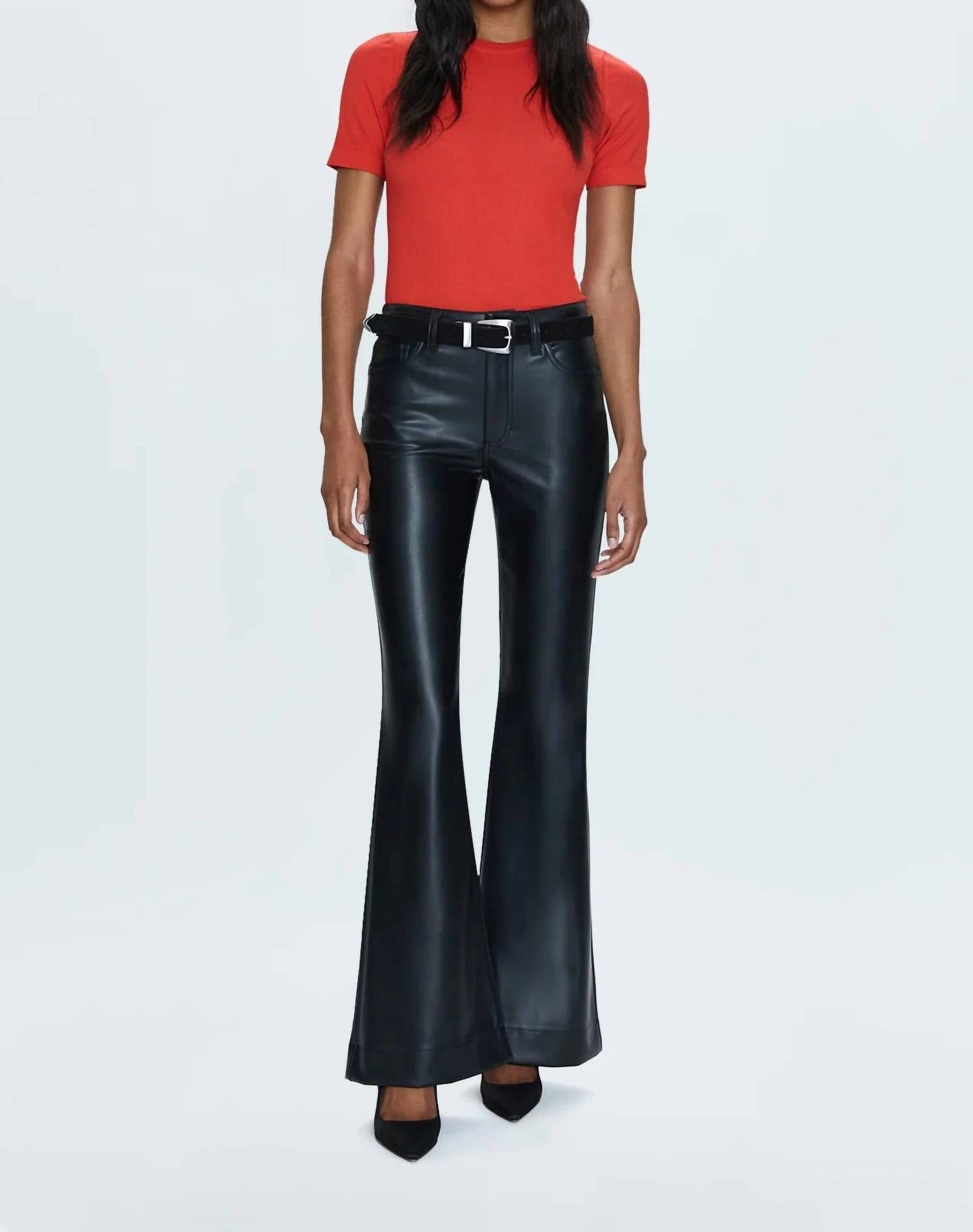 Pair these wide leg jeans with mules, slides or your favorite strappy sandals. Introducing the Kinsley Flare Jean by PISTOLA, a standout piece in sophisticated Slate Black with a signature vegan alt leather finish. This women's flare and wide-leg jean is crafted from 100% Polyurethane, featuring a relaxed fit with a mid-rise waist, ultra-flared leg, and zip closure. Designed for a dramatic effect, the jean boasts a 10-inch rise, 33-inch inseam, and 23-inch leg opening. Perfect for fall occasions like dinner parties and New Year's Eve, these jeans require dry cleaning to maintain their impeccable style. Model is wearing size 26 and stands 5’9” tall.