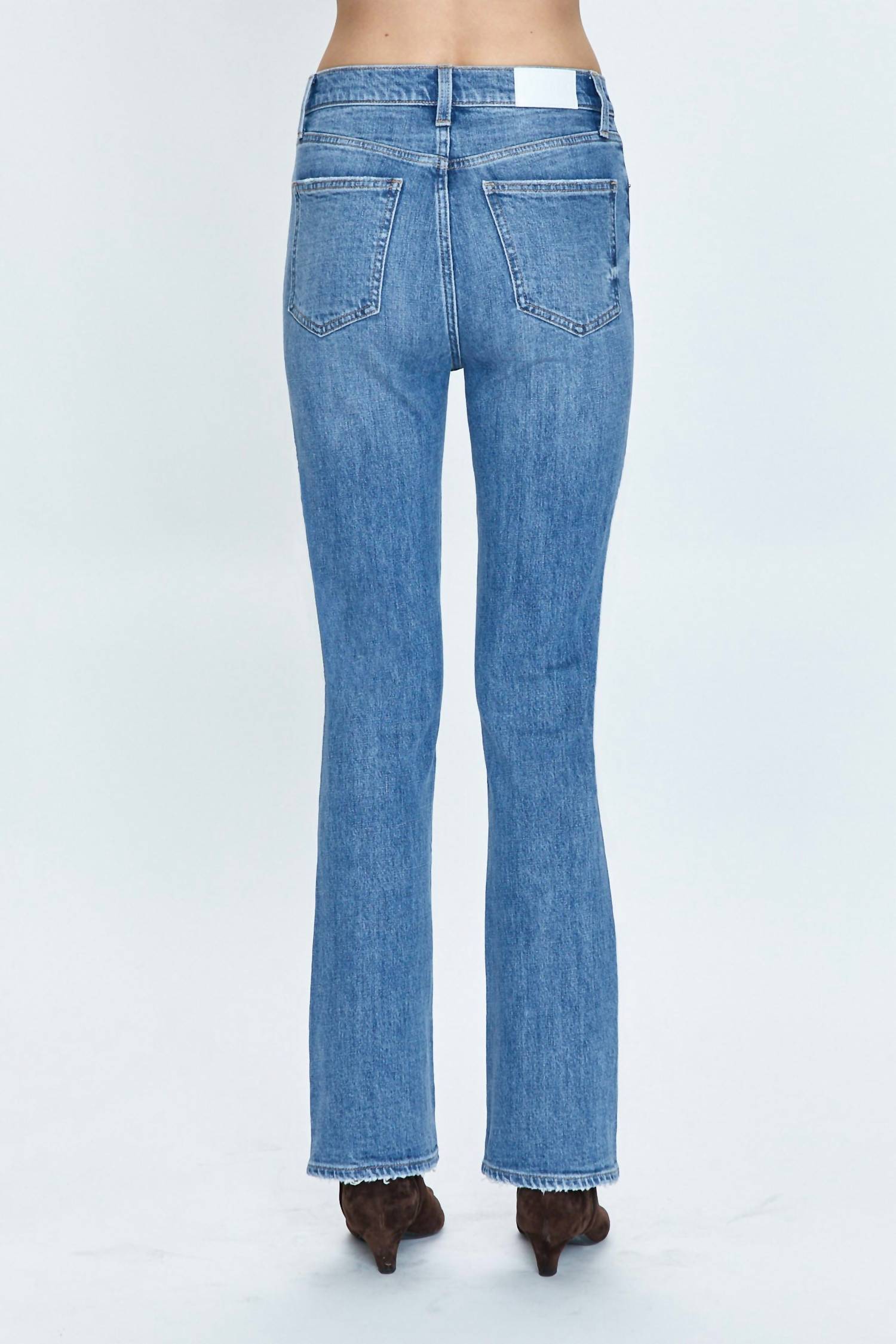 A boot-cut jean that not only looks good on, you'll be comfortable in them all day. Introducing the Krista High Rise Slim Boot Cut Jeans by PISTOLA, a modern take on the classic bootcut for women. These jeans feature a high rise waist and a slim fit, crafted from a cotton blend for comfort with a zip closure. Presented in a vibrant blue with a vintage-inspired medium wash, they exude a boho chic appeal suitable for spring occasions like Thanksgiving dinner parties. Composition: 72% Cotton, 27% Rayon, 1% Spandex. Care: Machine wash.