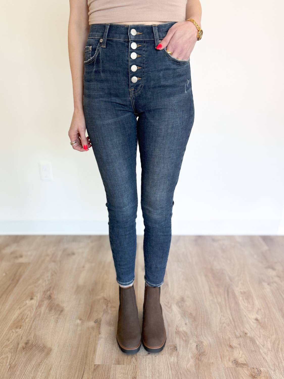 The perfect skinny jeans to wear with your favorite boots this season! Elevate your wardrobe with the Pistola Lacey High Rise Dark Wash Jeans, ideal for pairing with your favorite crop tops or sweaters. These skinny jeans feature a comfortable high rise fit and a button-front closure, perfect for accentuating your curves. Crafted from a cotton blend comprising 76% Cotton, 20% Recycled Polyester, 2% Lycra, and 2% Rayon, they offer a light stretch along with stylish distressing and an unfinished hem. Seasonally perfect for Fall, these jeans showcase a versatile dark wash with subtle fading, catering to the latest Y2K trends.