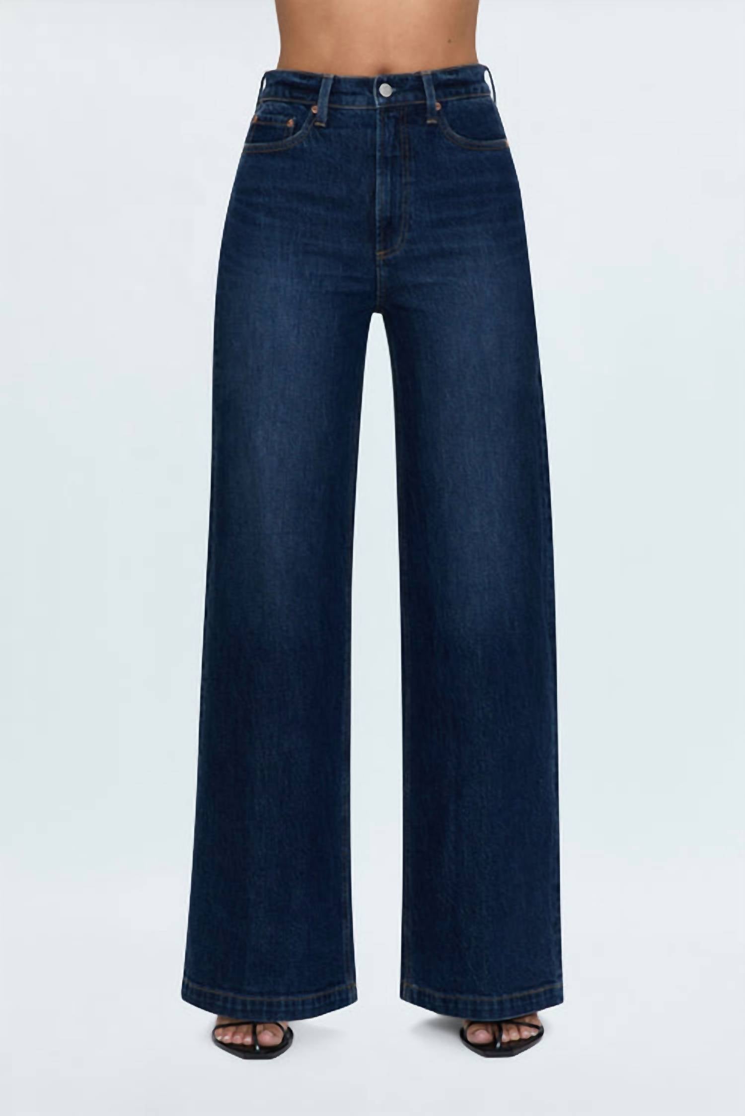 A flattering silhouette that's suprisingly versatile. This dark denim piece boasts a solid high-rise waist and ultra wide leg silhouette, ensuring both comfort and structure. Made from signature comfort stretch denim, these full-length jeans feature a button closure and include pockets for practicality. Enjoy a dark indigo wash with clean finishes, and keep them looking fresh with machine wash and tumble dry care instructions.