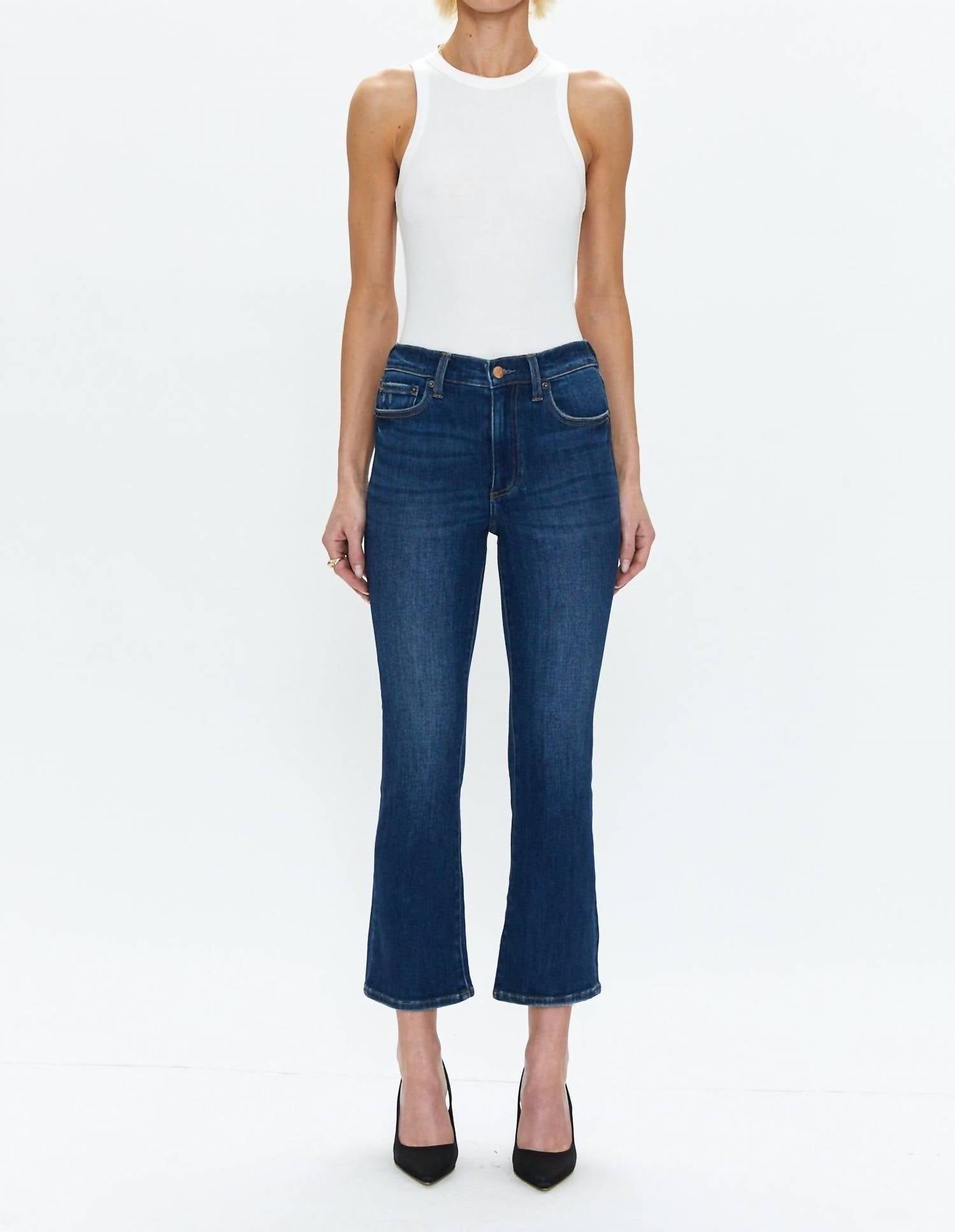 Fit to perfection, we love these high-waist jeans and you will too. This Lennon High Rise Crop Jeans features a high-rise waist, 27” inseam, and bootcut leg style. Crafted from a 95% cotton, 4% polyester, 1% elastane or 99% cotton, 1% elastane blend with a hint of stretch, it has a button closure and is machine washable for easy care.
