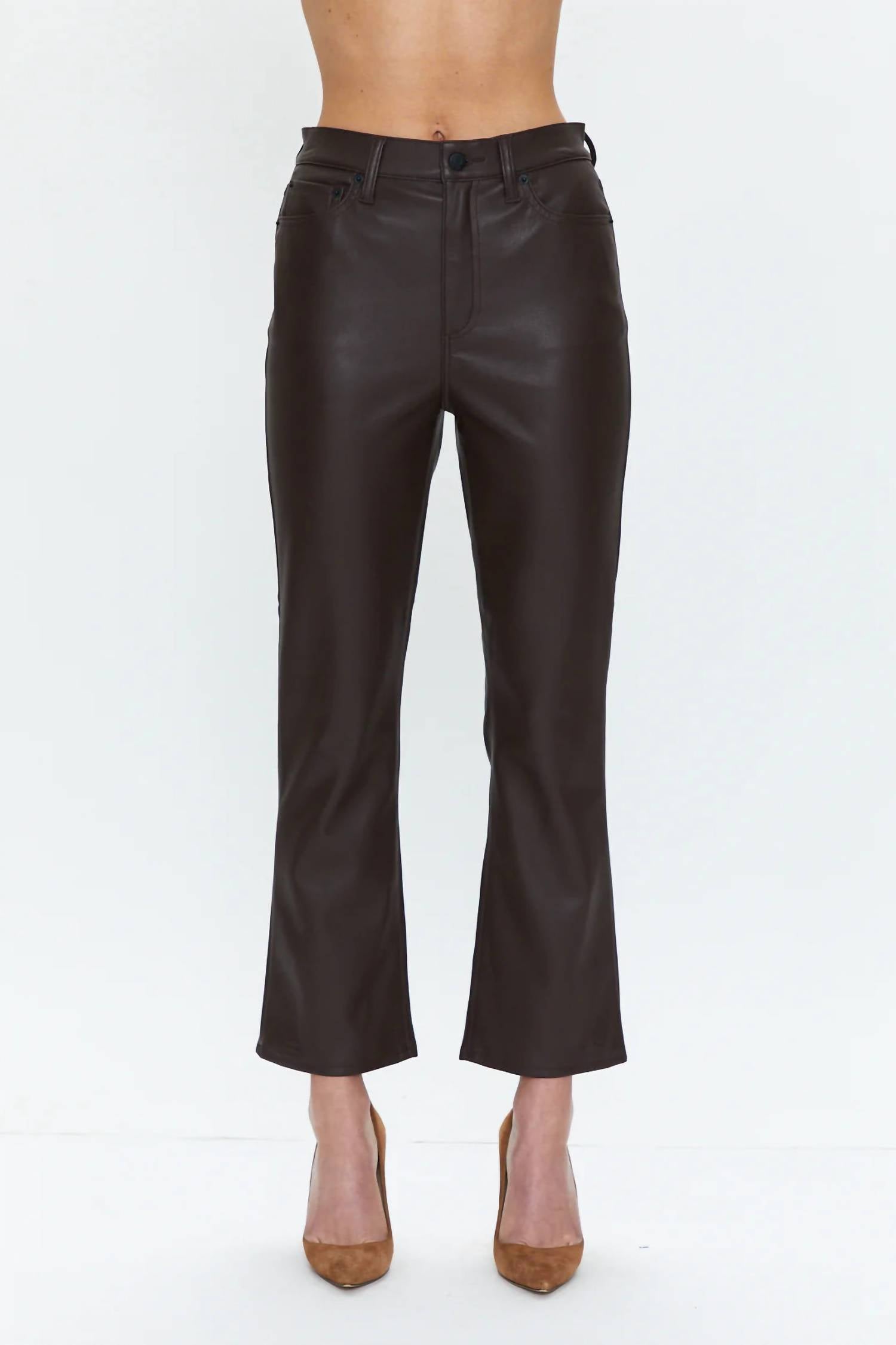A boot-cut jean that not only looks good on, you'll be comfortable in them all day. Elevate your wardrobe with the Lennon High Rise Jeans by PISTOLA in a chic Coffee Bean shade. Made from 100% Polyurethane, these women's bootcut leg jeans offer a relaxed fit with a high rise and a zip closure, providing both style and comfort. With a flattering rise of 11", an inseam of 27", and a leg opening of 16 1/2", these pants feature comfort stretch and are ideal for both workwear and dinner parties. Care: Machine wash cold. Model is 5'9" wearing size 26.