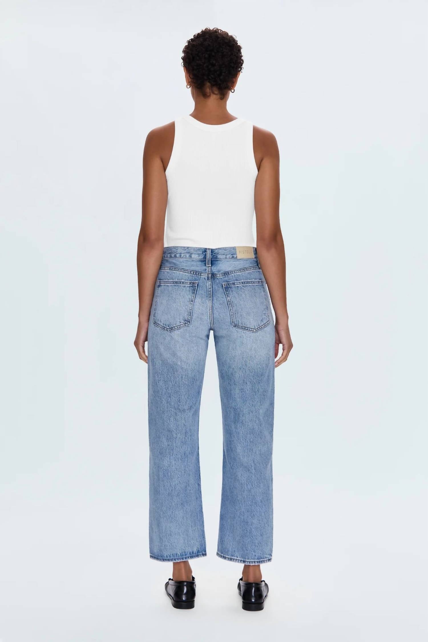 This classic straight leg jean has a perfect fit and goes with just about everything. Introducing the Lexi Mid Rise Bowed Straight Jeans by PISTOLA, a must-have for streetwear enthusiasts looking to make a statement. These women's jeans in a trendy Bowie color feature a unique slight bowed shape for a slimming and elongated look, complete with pockets for practicality. Crafted from quality denim, they boast a mid-rise, slim fit, with a zip closure, and sport a light wash with subtle knee fading. Care for this summer essential is simple with machine washing and tumble drying instructions. Ideal for dinner parties or casual outings, these jeans are set to elevate your wardrobe.