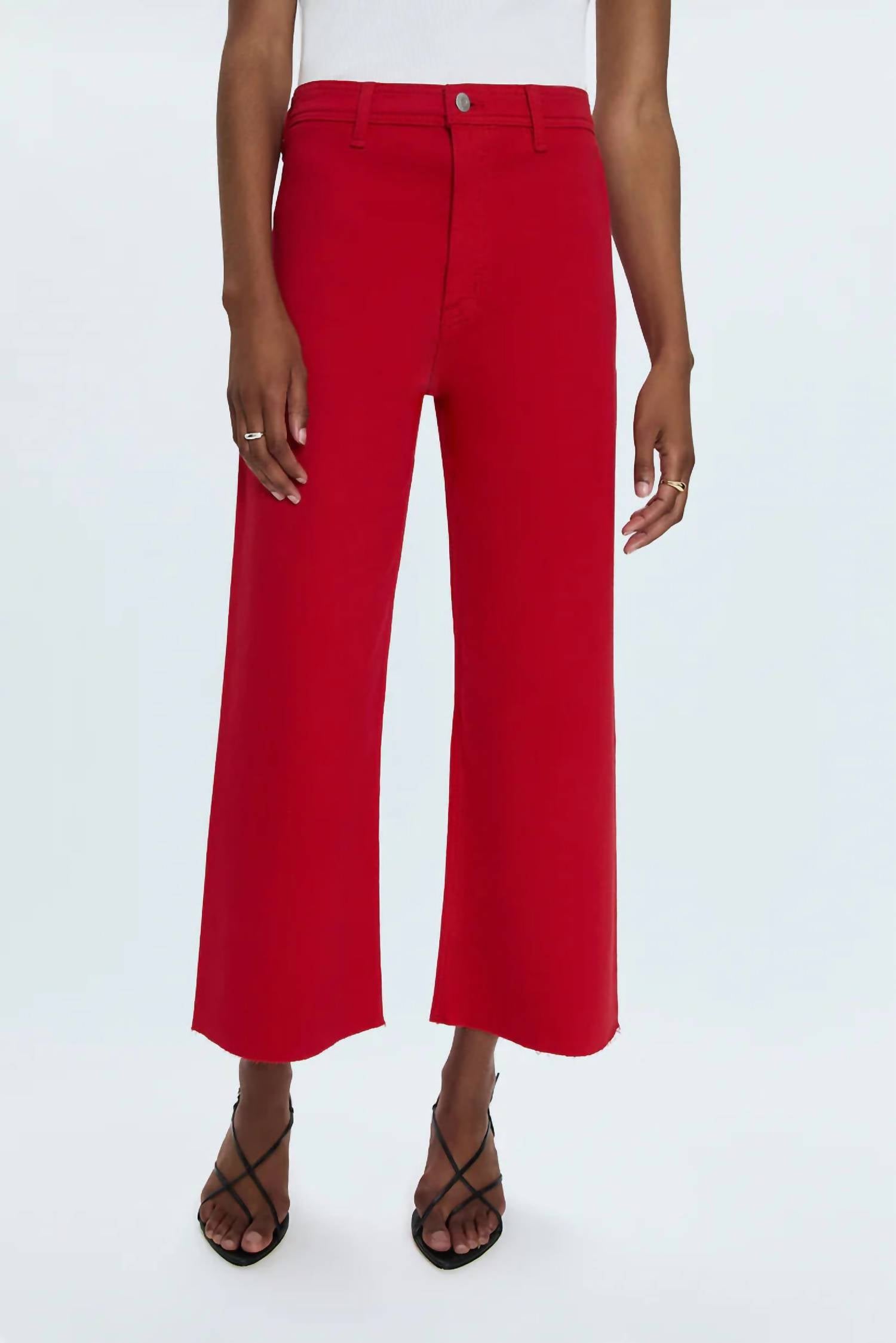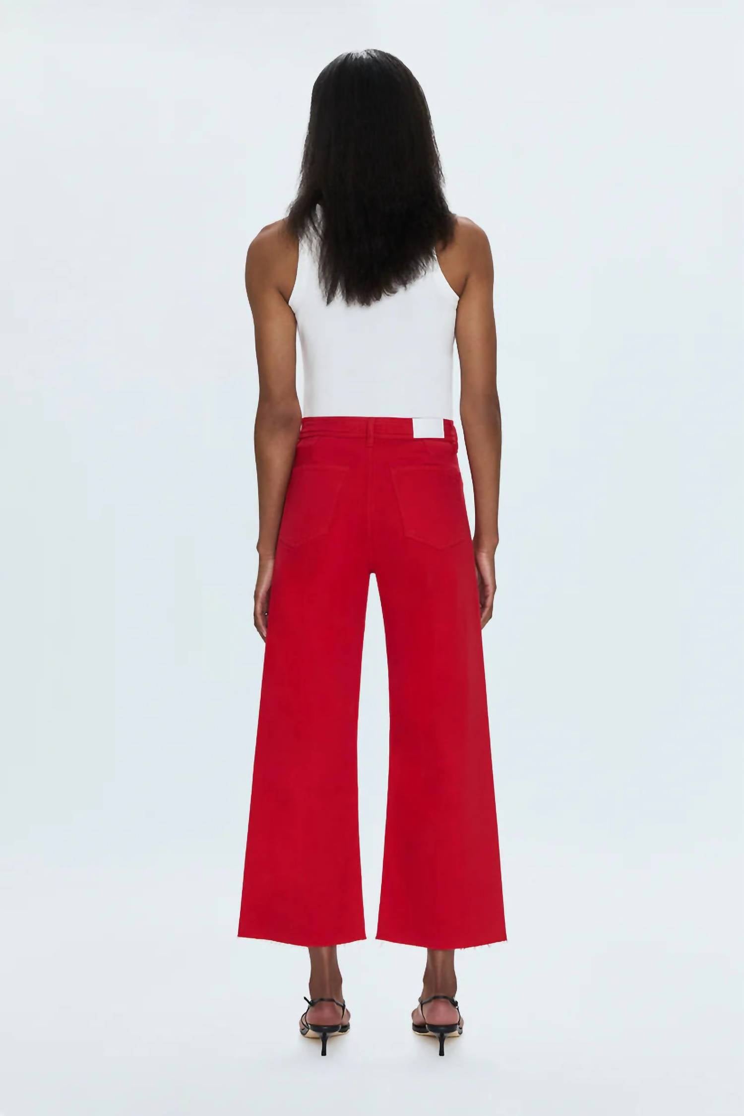 Just as cute as they are comfortable. Meet the Penny High Rise Wide Jean by PISTOLA, a vibrant addition to your summer wardrobe in exclusive Ruby red. Featuring a high rise waist and wide leg silhouette, these jeans present a cropped, ankle-length hemline that is both trendy and comfortable. Crafted from a cotton blend with 99% Cotton and 1% Elastane, they are imported from Mexico and include a button closure. Care for them by washing cold; do not specify additional drying instructions. With dimensions of a 12” rise, 21” leg opening, and 27” inseam, these jeans are modeled in a size 26 on a 5'9" individual, making them perfect for a holiday party or to keep up with 90s fashion trends.